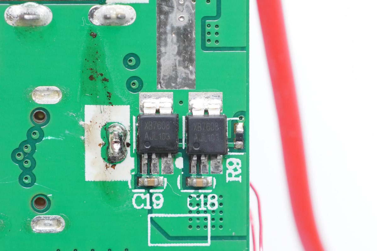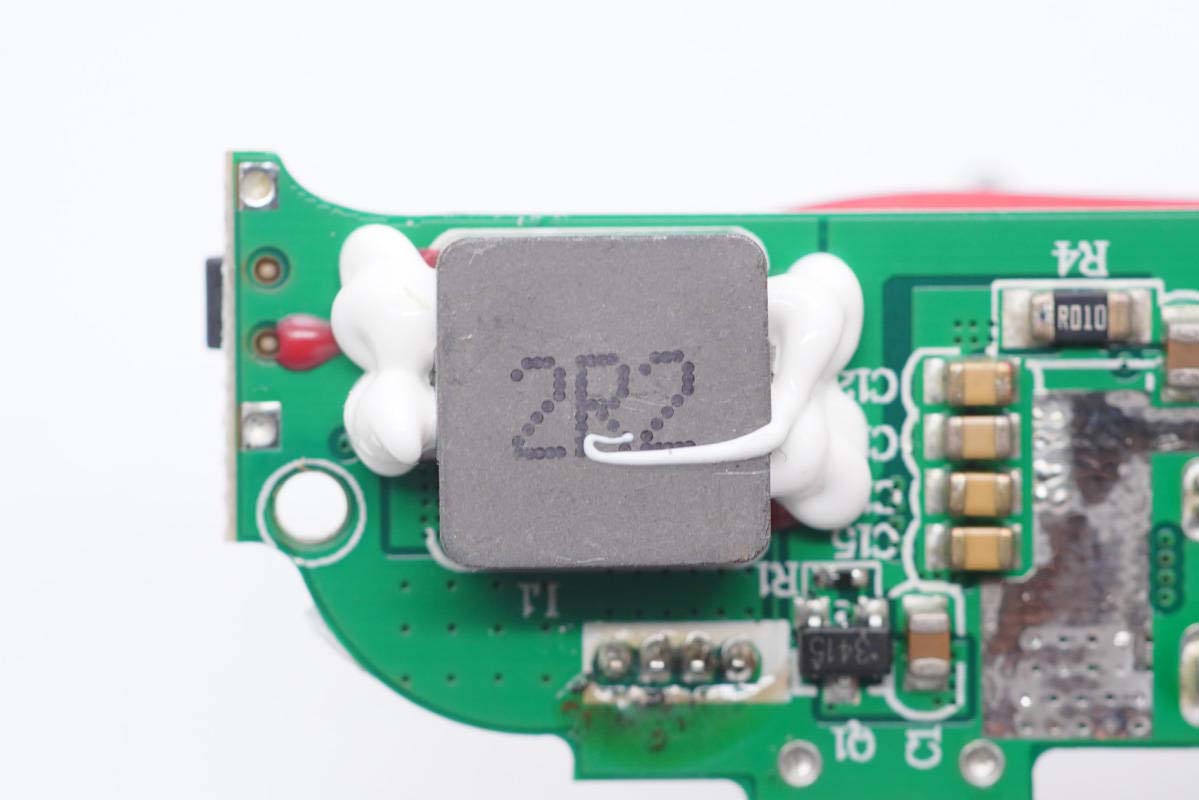2R2升降压电感特写,两侧涂胶加固,配合主控芯片进行升降压实现电芯充放电。