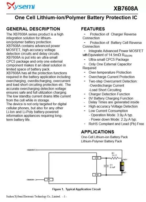 苏州赛芯微XB7608多合一锂电保护芯片,内置14.5mΩ导阻MOS管,外围元件只需要一颗电容,支持过热保护,过充保护,支持过放电保护和短路保护,其内部集成高精度电压检测,超低静态电流。两颗并联用于电池保护。