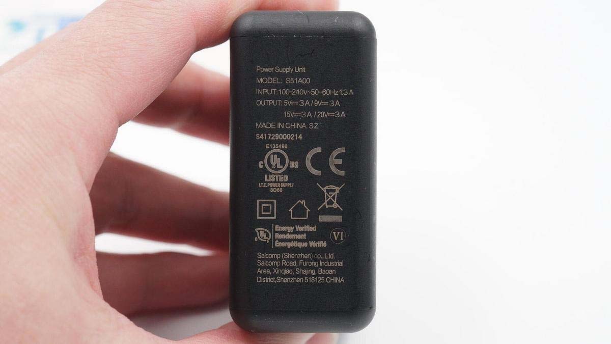 赛尔康这款充电器机身方正扁平,边角圆润。输入端采用线体分离式设计,放在该功率级充电器中都是非常少见的。另外充电器支持PD2.0快充协议,具备5V3A、9V3A、15V3A、20V3A五组固定电压档位,可以满足笔电等设备的快充需求。