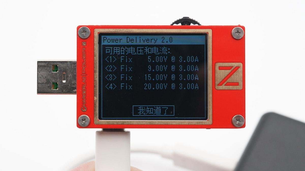 使用ChargerLAB POWER-Z KT002检测USB-C口输出协议,显示支持Samsung 5V2A、DCP协议,以及PD2.0快充协议。