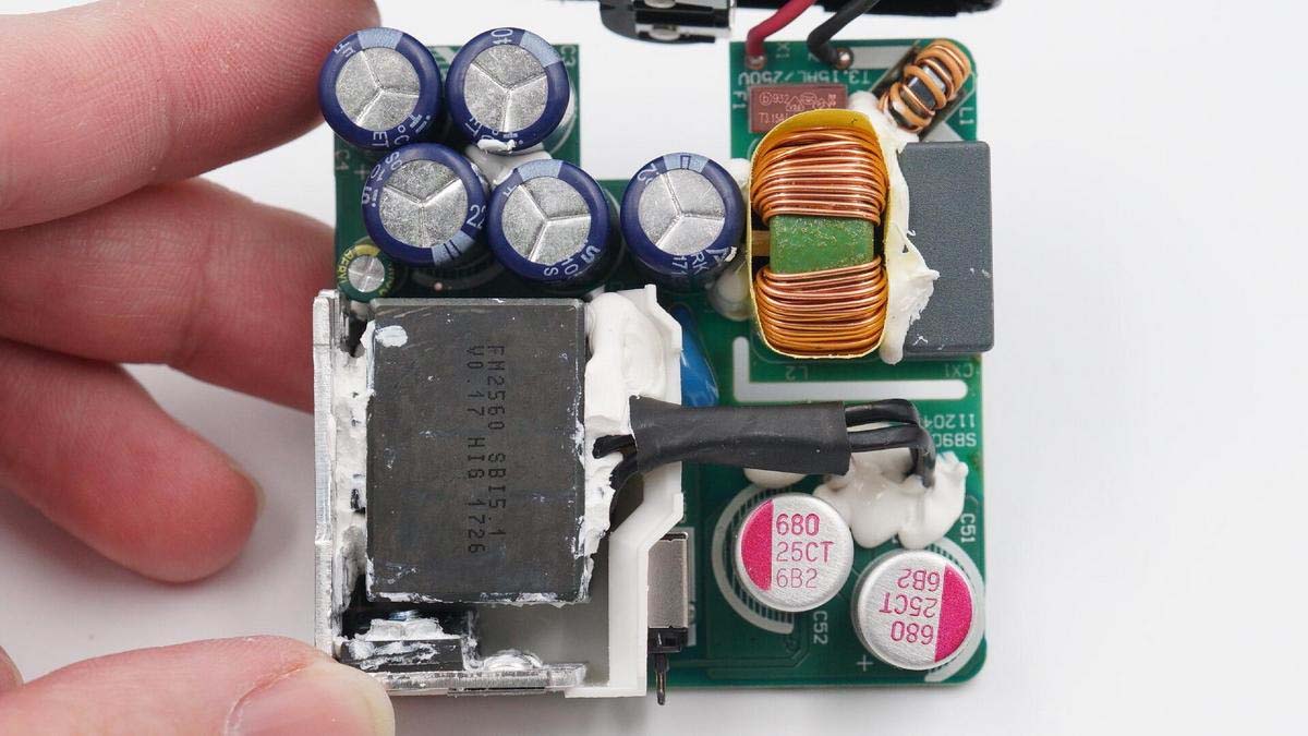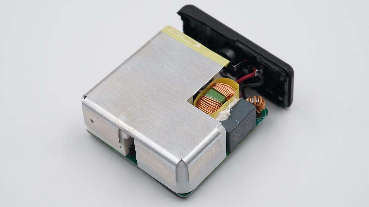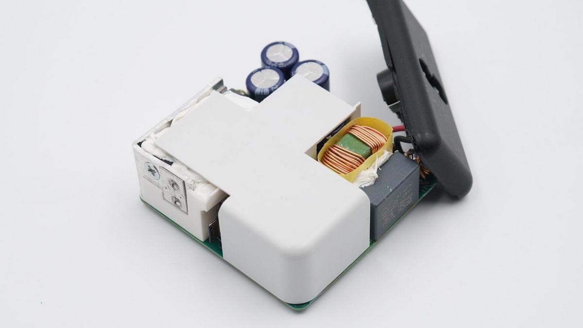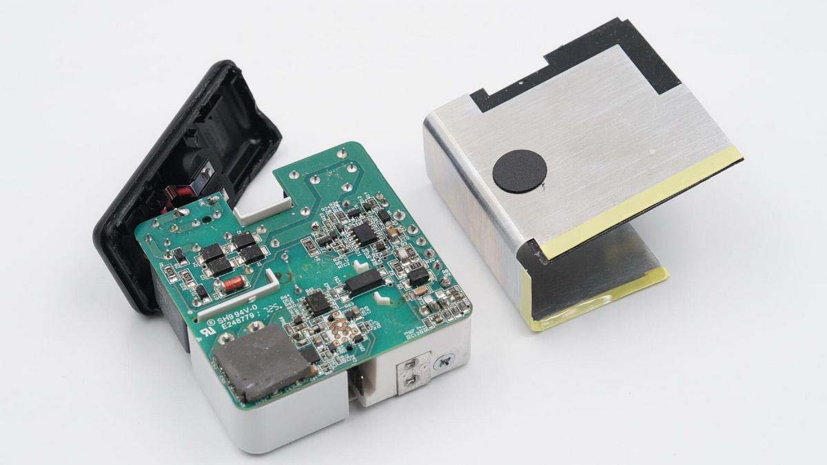基于恩智浦上述快充方案设计的这款充电头功率密度可以做到0.9W/cm³,表现非常不错,甚至可以看到PCB板还留有余量空间,功率密度可以做得更高也是可能的。