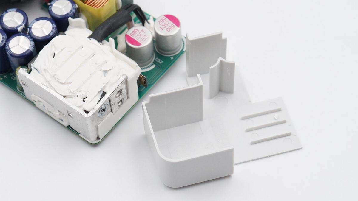 将硅胶清理干净,散热片上固定有初级开关MOS管,输入端设有多达5颗高压滤波电解电容,次级侧有绝缘板与初级隔离。