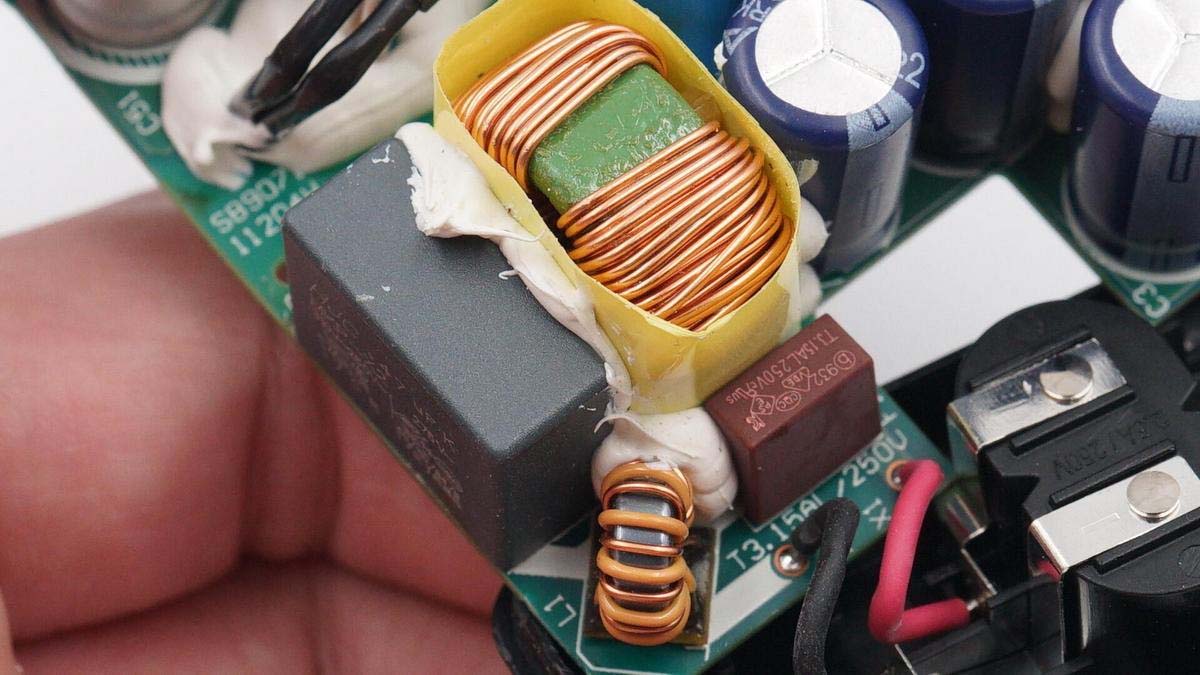 输入端设有两级共模电感用于滤除EMI干扰,大颗的包裹绝缘胶带。