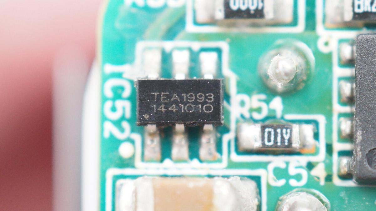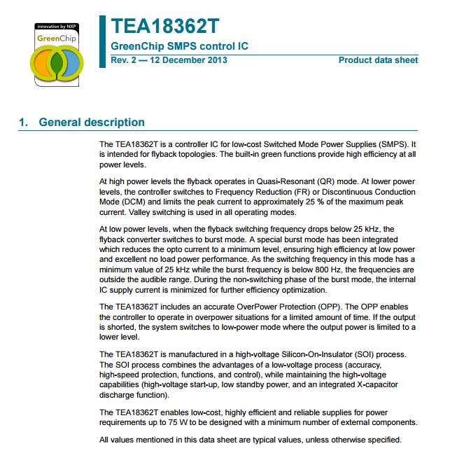 充电器主控芯片采用NXP恩智浦TEA18362T,支持绿色模式的反激控制器,支持高负载时准谐振模式运行,轻负载降低频率或采用DCM模式运行降低功耗,采用谷底开通。
