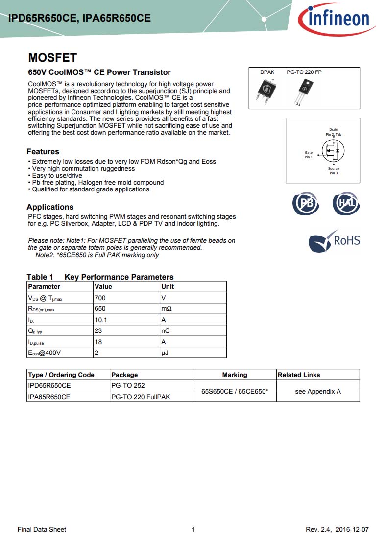 初级开关管来自英飞凌,IPA65R650CE,700V耐压,650mΩ导阻。