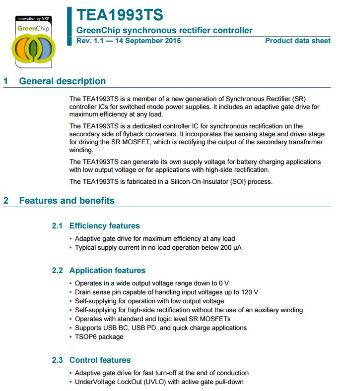 次级同步整流控制器采用恩智浦TEA1993TS,适用于反激适配器,外围简单,无需辅助绕组。