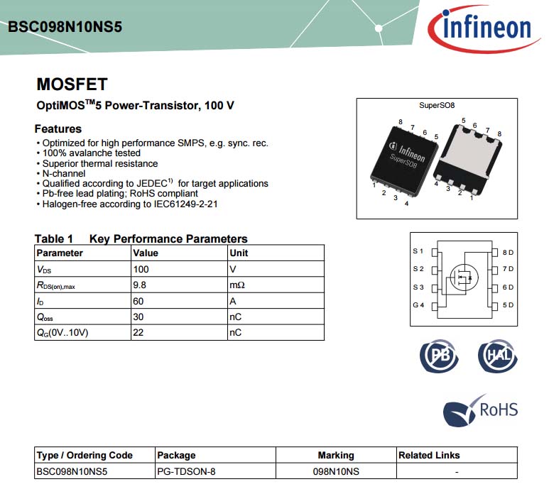 同步整流管也是来自英飞凌,型号BSC098N10NS5,耐压100V。