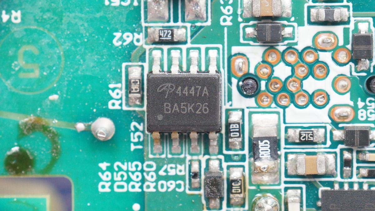 输出VBUS开关管采用AOS万代AO4447A,耐压30V。右侧R005电阻用于输出电流检测。