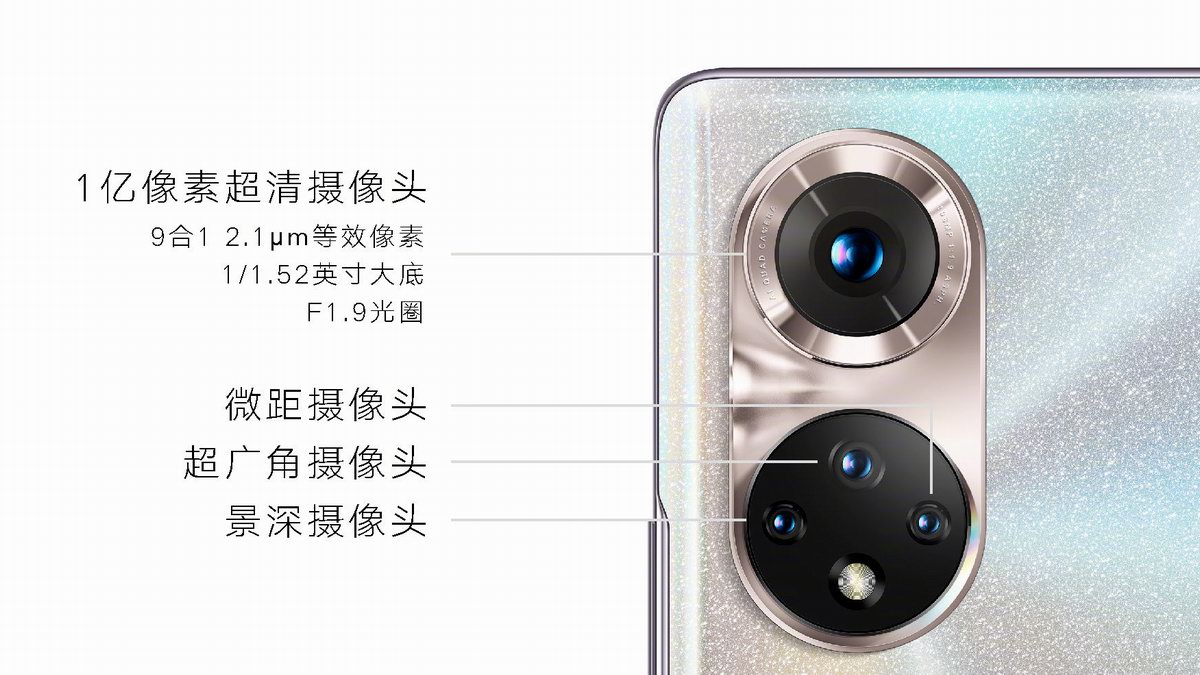 荣耀50系列后摄像模组采用了致敬双镜头反光相机的ID设计,上下两个区域中轴对称,戒环金属镜圈突出主摄强大的拍摄能力,1/1.52英寸大底主摄拥有1亿像素超清拍摄能力,800万像素超广角镜头+200万像素景深镜头+200万像素微距镜头。