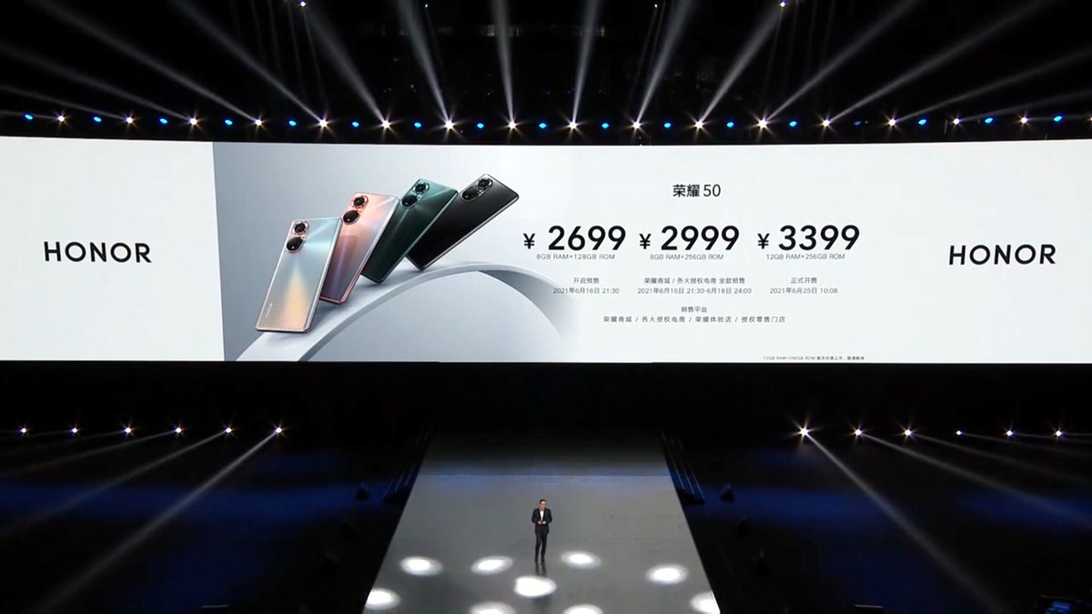 荣耀50共有四款颜色可选,6.57英寸75度超曲屏中置挖孔前摄,120Hz刷新率,一亿像素四摄,骁龙778G处理器,4300mAh单电芯双回路多极耳电池,搭载66W超级快充,共有三种容量配置。8GB + 128GB:2699元,8GB + 256GB:2999元,12GB + 256GB:3399元。