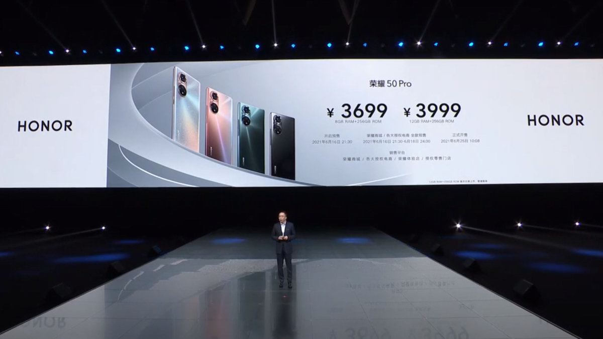 荣耀50 Pro共有四款颜色可选,6.72英寸75度超曲屏左上双挖孔前摄,120Hz刷新率,一亿像素四摄,骁龙778G处理器,4000mAh单电芯双回路多极耳电池,搭载100W超级快充,共有两种容量配置。8GB + 256GB:3699元,12GB + 256GB:3999元。