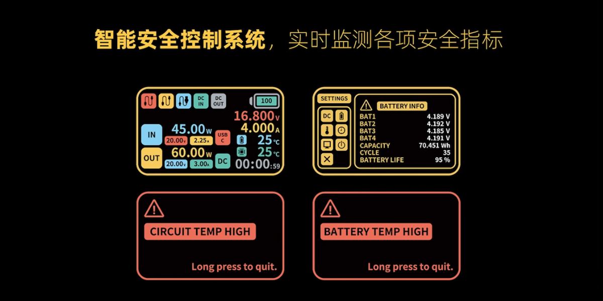 闪极超级移动电源内建过温保护、低温保护、主板短路保护、重启保护、输出过压保护、输出过流保护、电池过流过放保护、电池短路保护等一整套的保护机制,并固化到芯片内部进行硬件级保护,实时自动监控各项参数,一旦遇到危险状况就会切断整个系统的工作,确保安全。