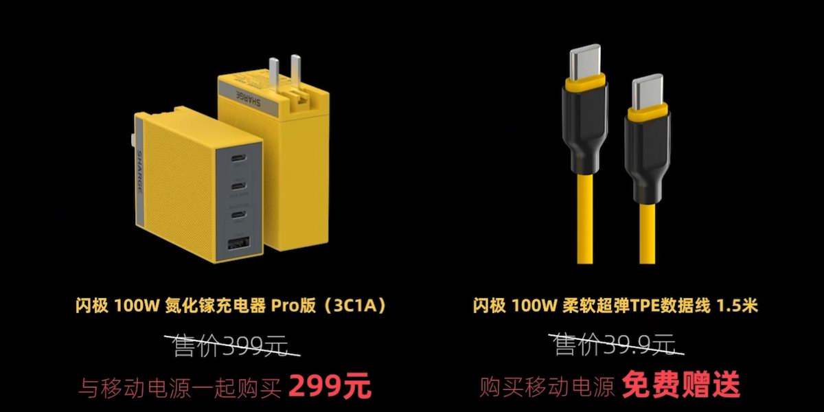 最后是售价环节,闪极 100W 氮化镓充电器 Pro 版日常定价为 399 元,闪极 100W 柔软超弹 TPE 数据线日常定价为 39.9 元。与闪极超级移动电源一起购买时,闪极 100W 氮化镓充电器 Pro 版售价直降 100元,299元到手,数据线则免费赠送。