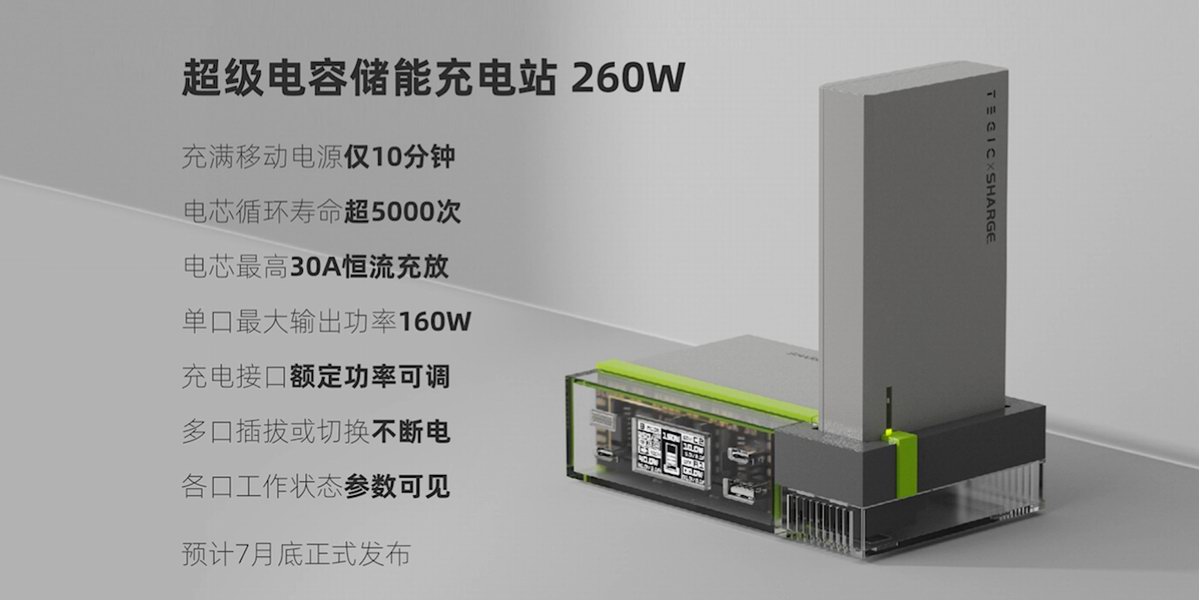 在发布会最后,闪极还透露了未来 7 月份将与著名极客品牌“TEGIC”联手打造一款新产品——超级电容储能充电站,采用新能源公交汽车上的超级电容作为能量载体,电芯循环寿命超 5000 次,支持 30A 恒流充放,充满移动电源仅需 10 分钟。输出性能方面单口最大输出功率达 160W 之高,多接口配置并支持插拔切换不断电功能,多功能信息屏各项参数可见。对于这款超级电容储能充电站可谓是又一次颠覆人们的印象,具有划时代意义,小编十分期待 7 月份正式发布。以上就是本次闪极科技 2021 新品发布会的全部内容,感谢大家观看,后续充电头网将会为大家送上产品的各种测试与体验,敬请留意。