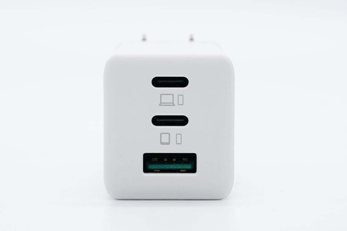 机身顶部配有2C1A接口,USB-C口黑色胶芯不露铜,USB-A口绿色胶芯,另外C口旁印有笔电、平板和手机标识。