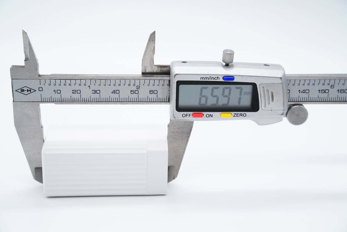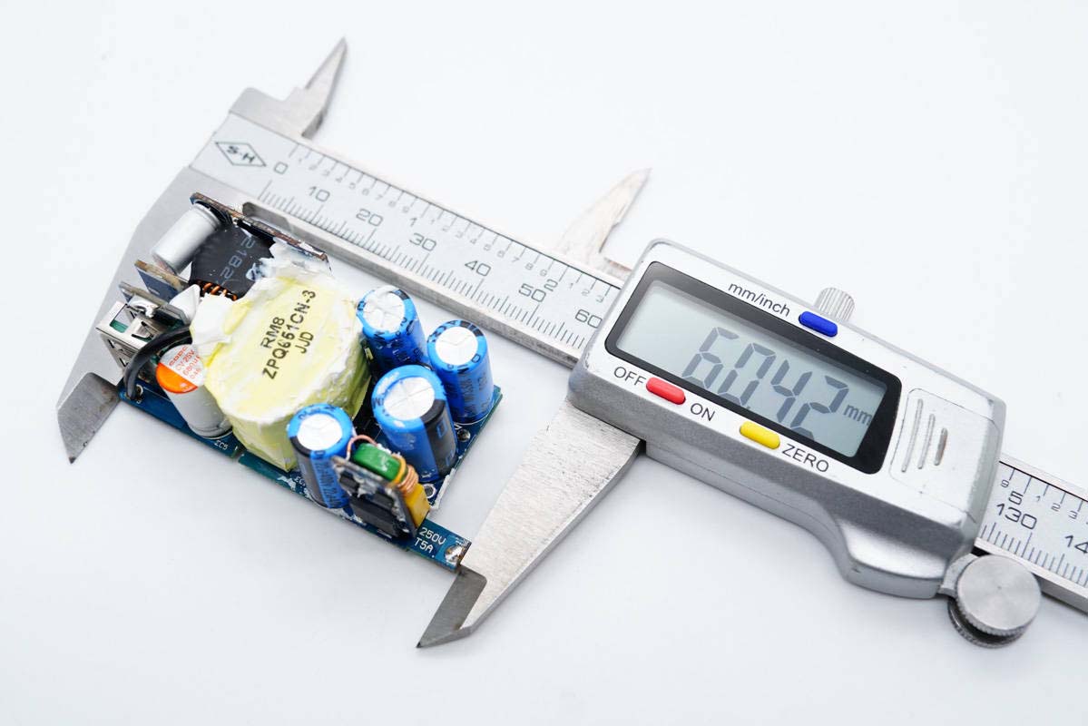 使用游标卡尺实测充电器机身长度为65.97mm。