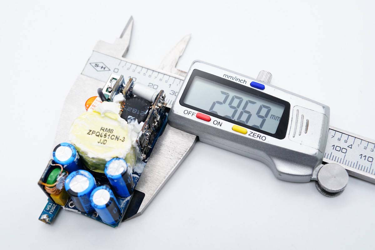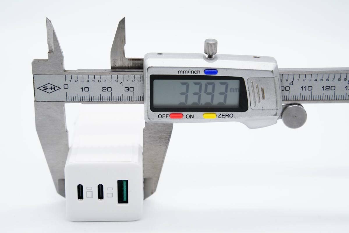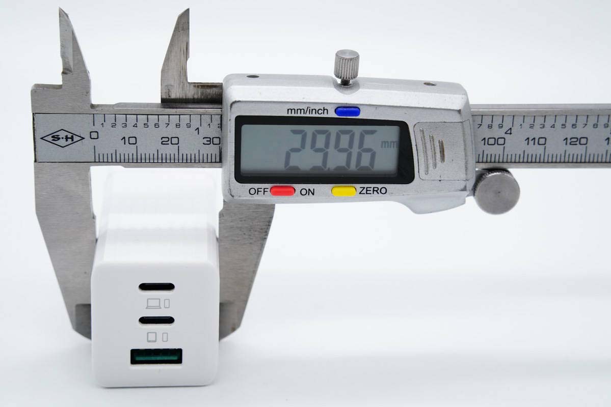 厚度为33.93mm。通过三维可计算得充电器体积为67.06cm³,那么功率密度约为0.97W/cm³,多口氮化镓充电器中的佼佼者。