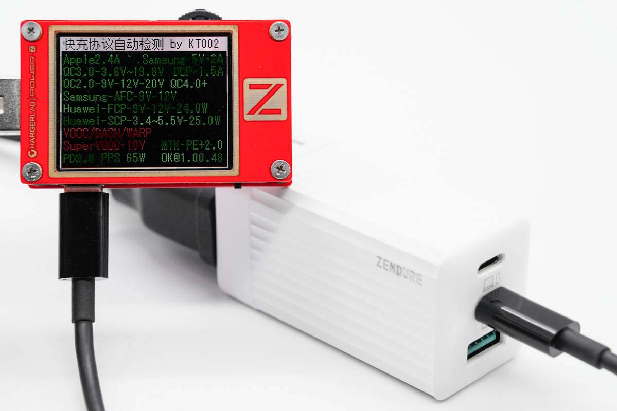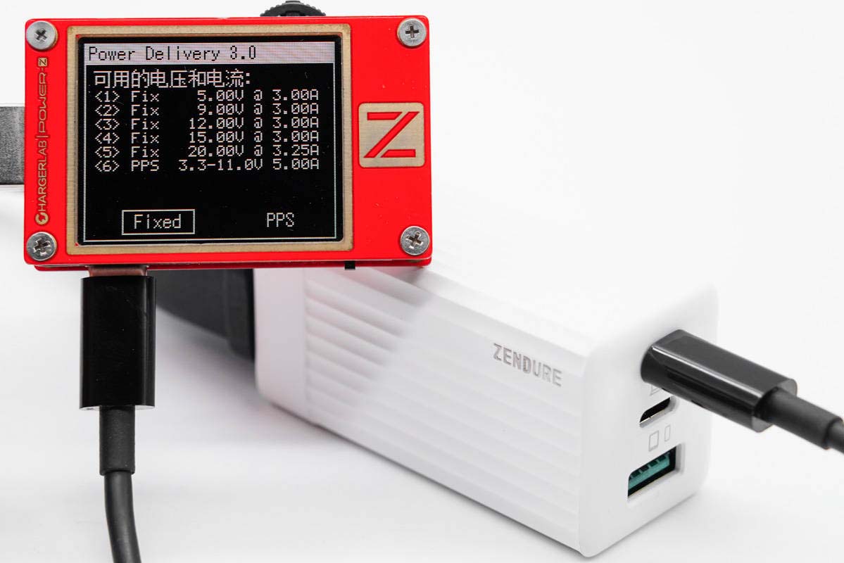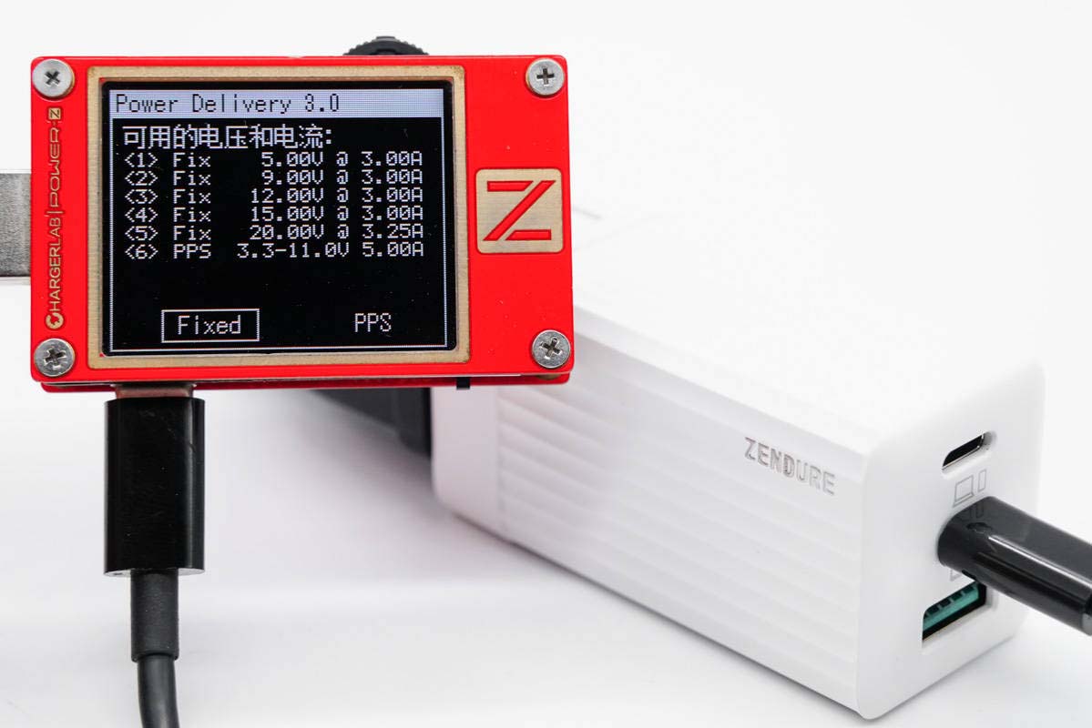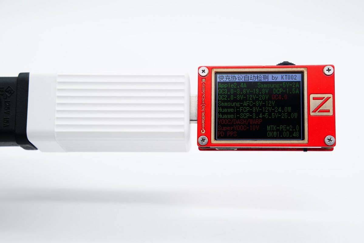 使用ChargerLAB POWER-Z KT002检测USB-C1口的输出协议,显示支持Apple 2.4A、Samsung 5V2A、DCP协议,以及QC2.0/3.0、AFC、FCP、SCP、PE2.0、PD3.0、PPS快充协议,兼容性非常好。