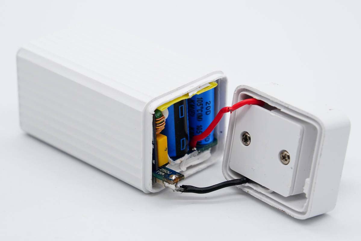 充电头网通过拆解了解到,作为一款柱状造型充电器,内部采用了经典的三段式布局设计,层次分明,输入输出端设有小板,充分利用内部空间。其次充电器采用开关电源加两路DC-DC架构,也很典型。