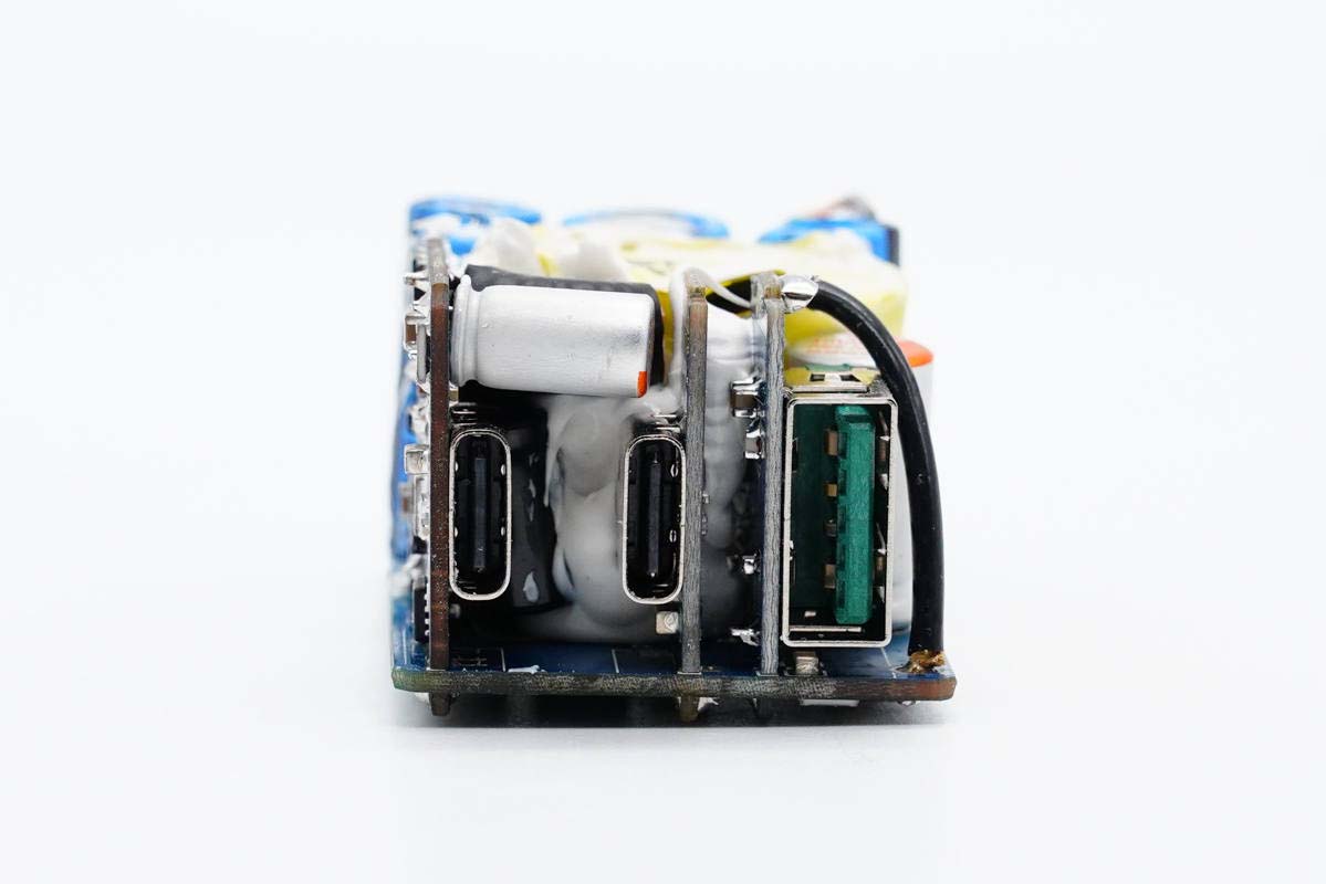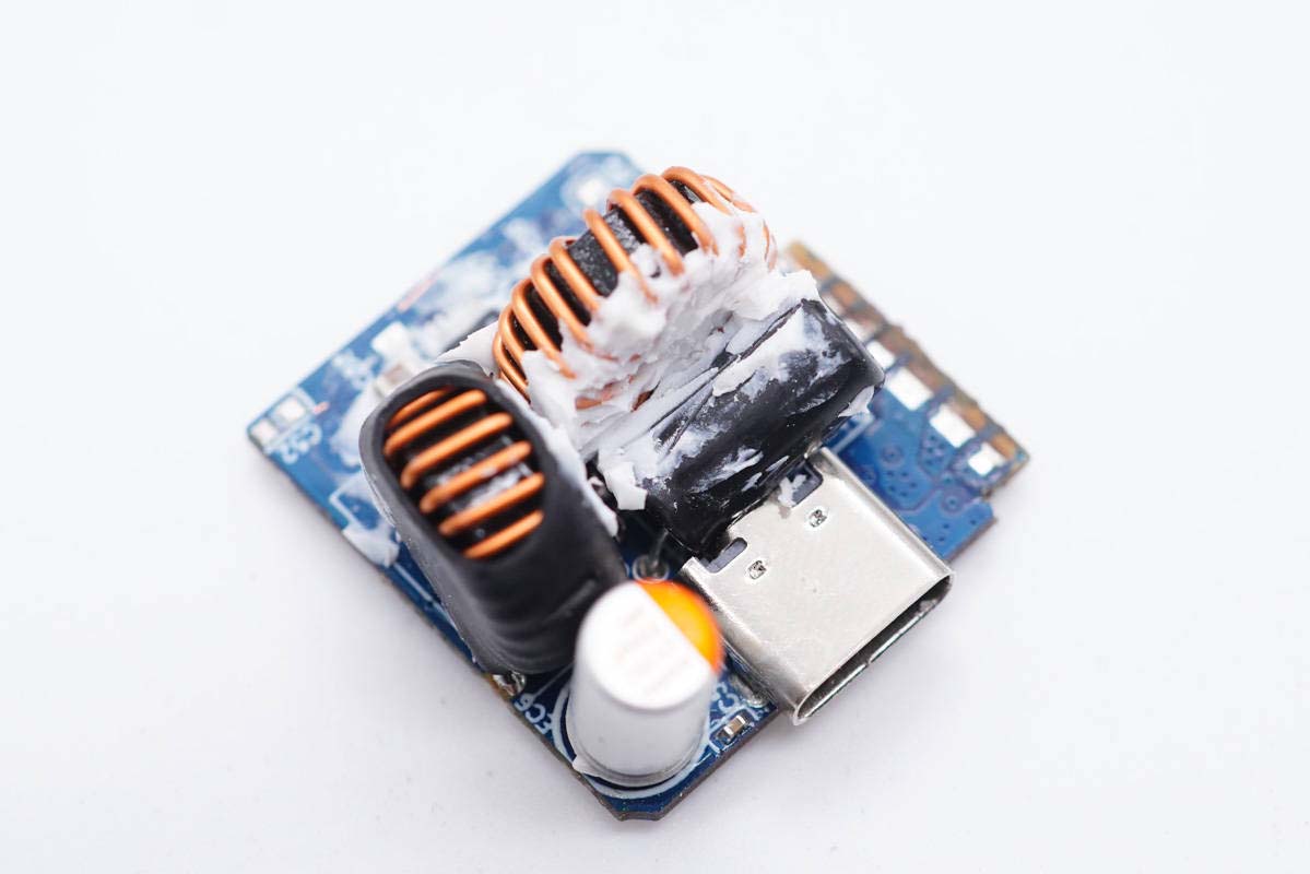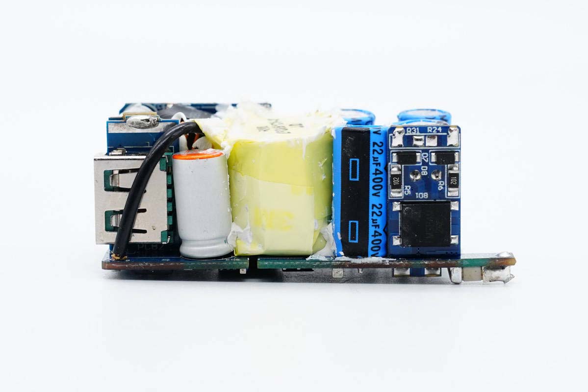 PCB板侧面一览,中间放置变压器,左侧是输出滤波固态电容和USB-A母座。
