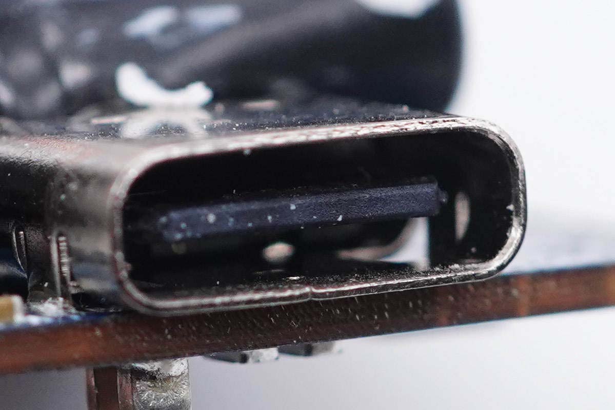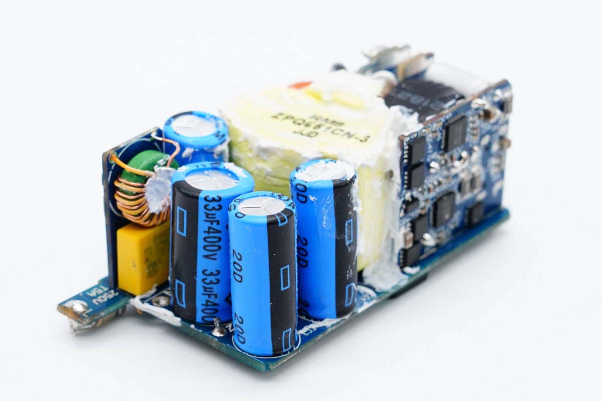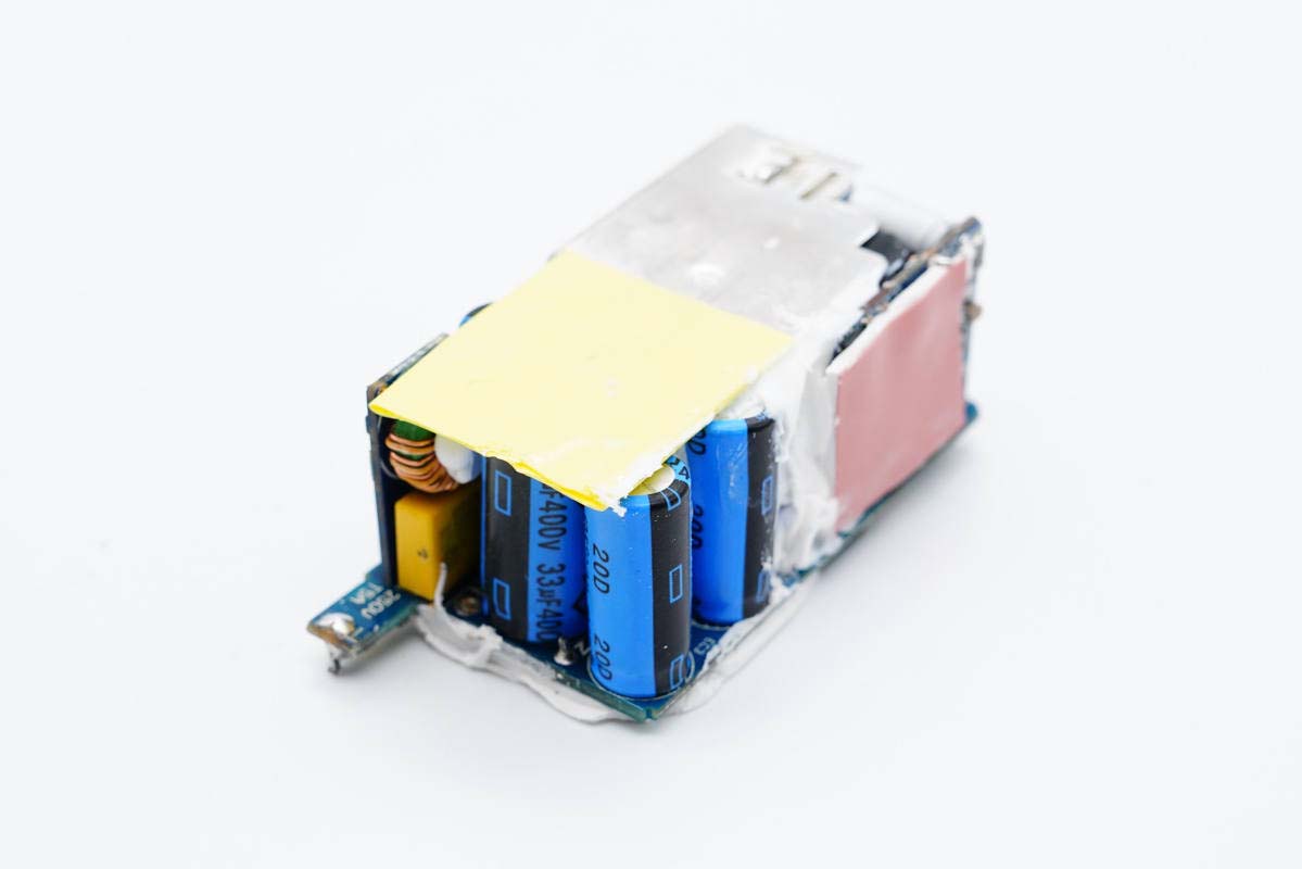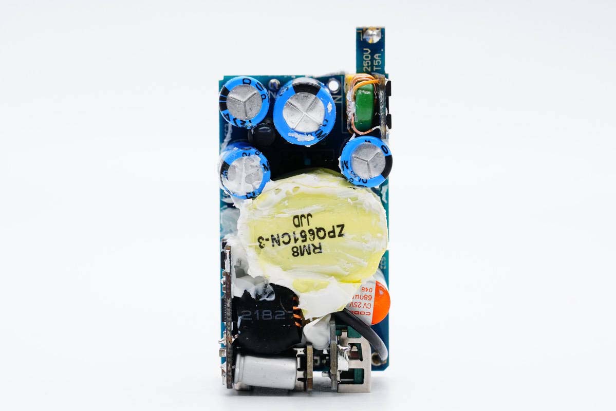 PCB板侧面一览,中间放置变压器,左侧是输出滤波固态电容和USB-A母座。