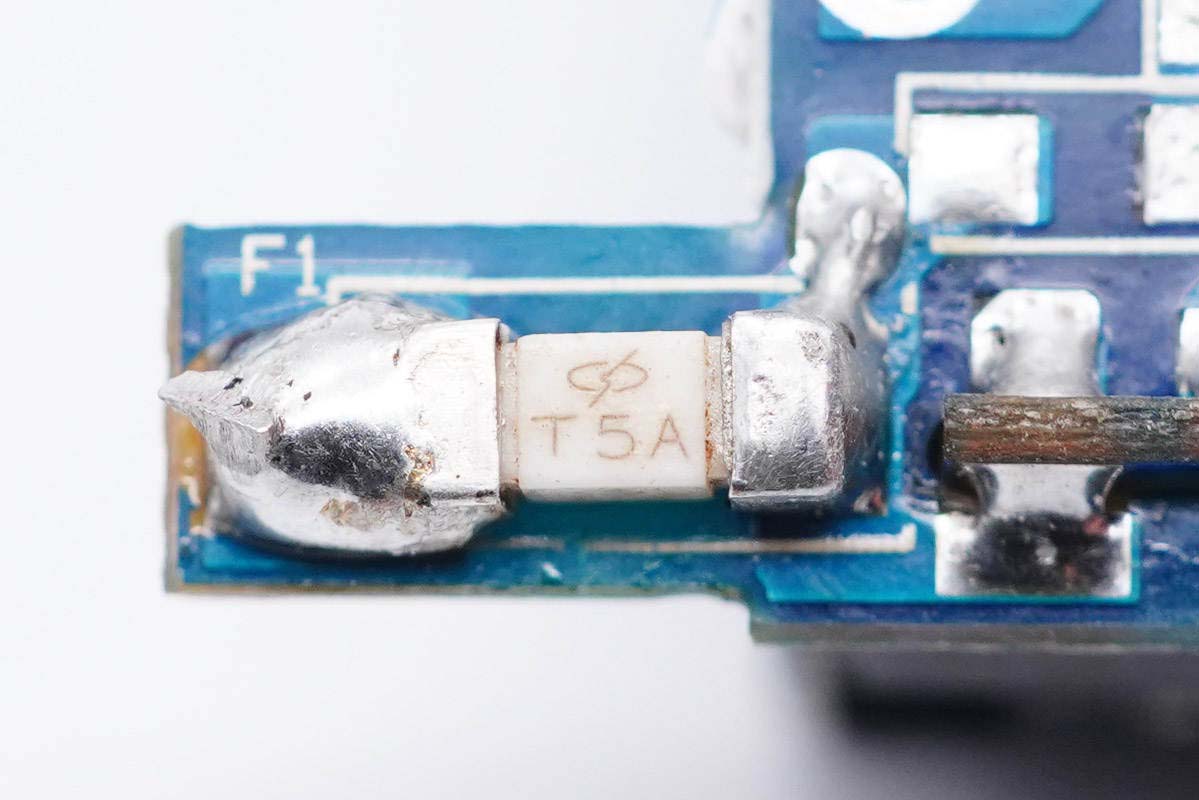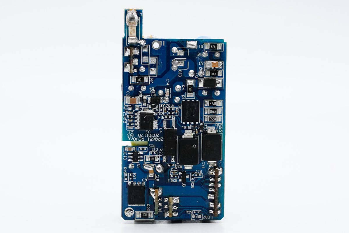 PCB板背面一览,光耦以及两颗贴片Y电容横跨初次级,初级侧设有贴片保险丝、主控芯片和氮化镓功率开关管,次级侧设有同步整流控制器和整流管。