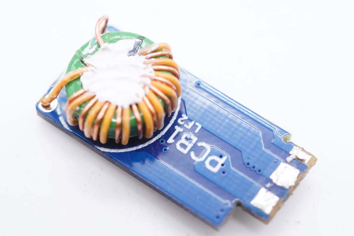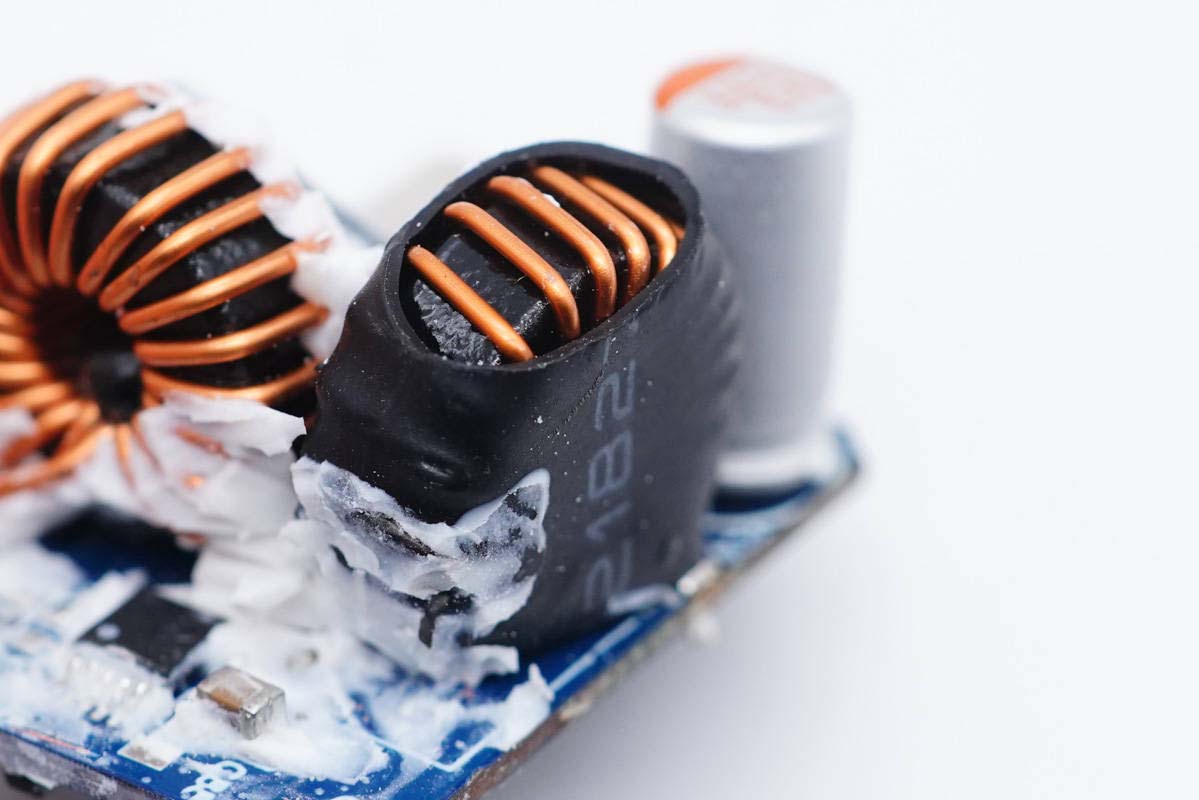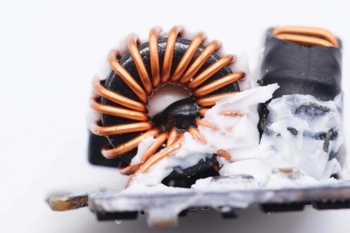 共模电感特写,双线绕制,用于滤除EMI干扰。