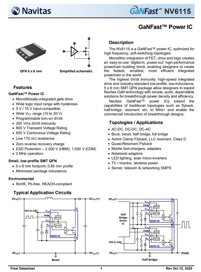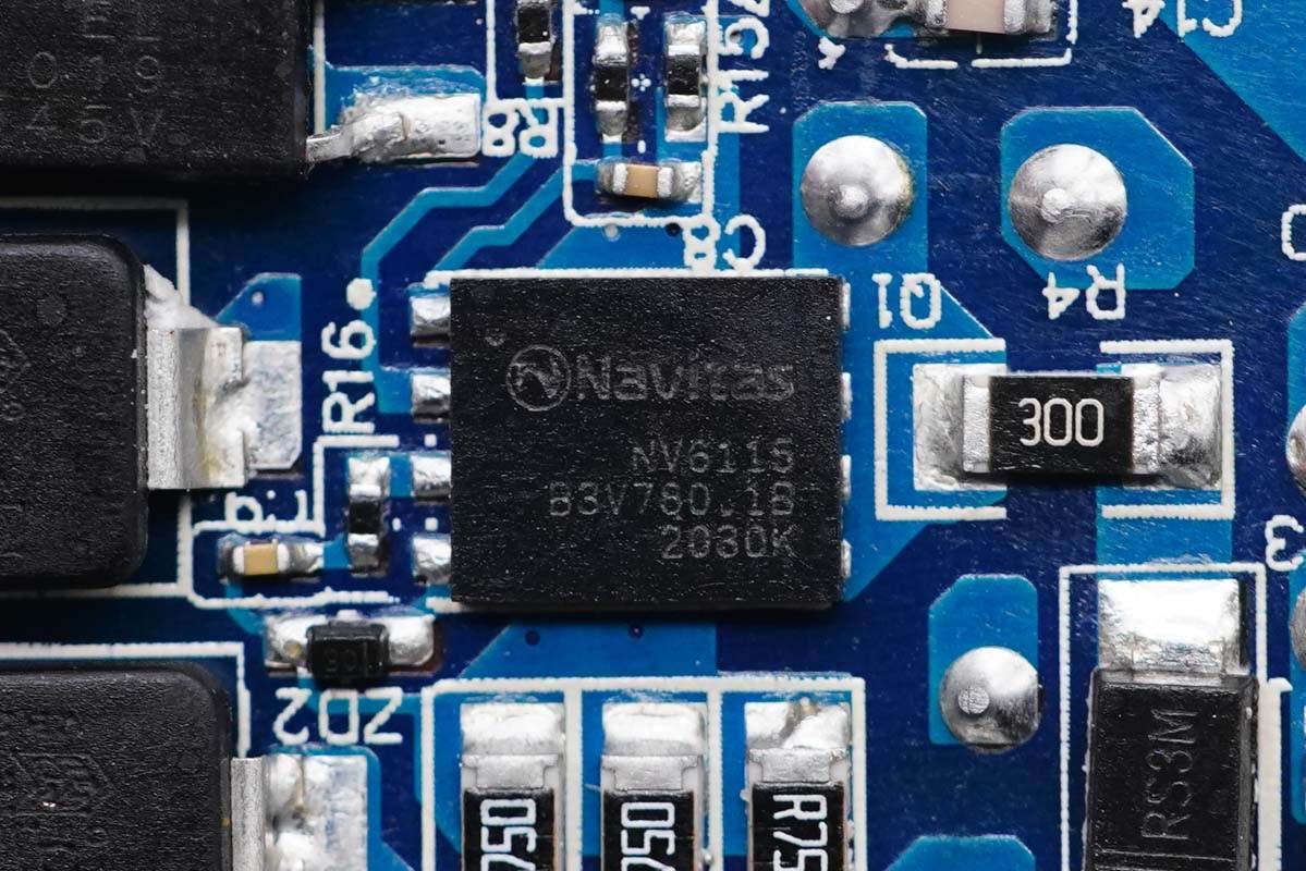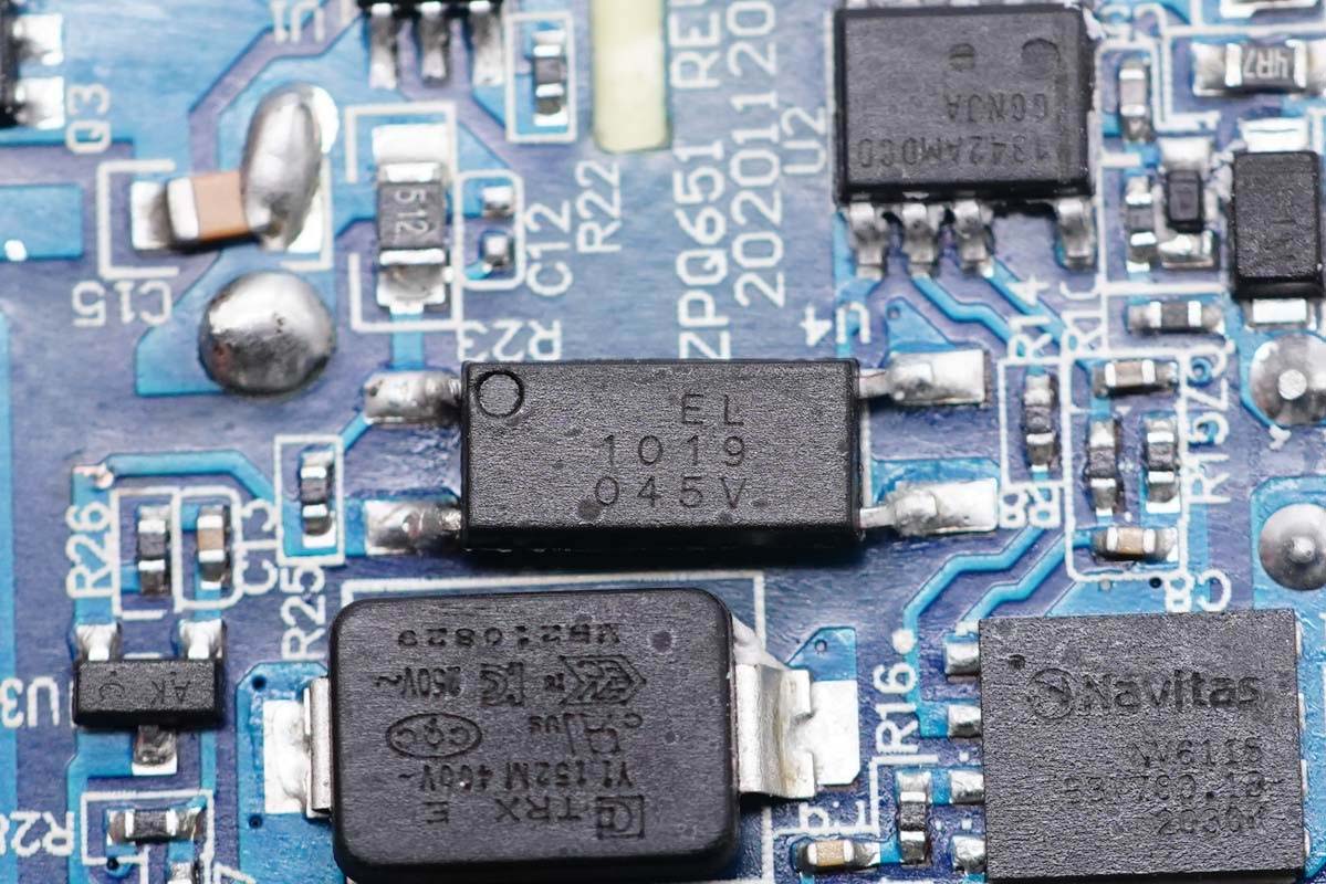 氮化镓功率开关管采用纳微NV6115,这是充电器的核心元器件。NV6115内置驱动器以及复杂的逻辑控制电路,170mΩ导阻,耐压650V,支持2MHz开关频率,采用5*6mm QFN封装,节省面积,得益于NV6115内置驱动器,无需外置驱动器,更加节省PCB空间。