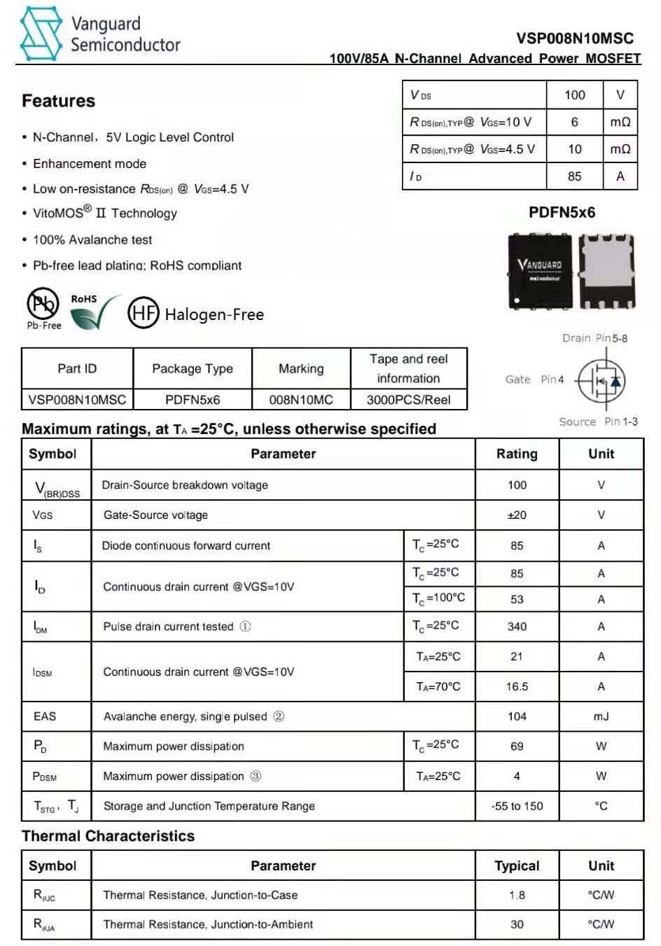 同步整流MOS管采用威兆VSP008N10MSC,NMOS,耐压100V,PDFN5x6封装。