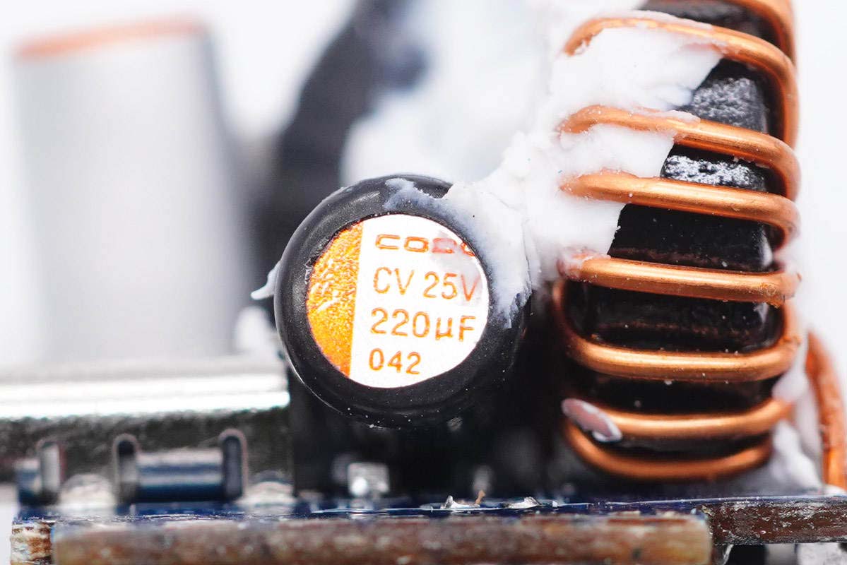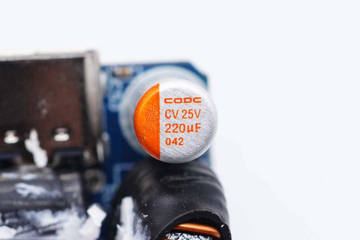 降压输出滤波固态电容也是来自华容伟业,规格为25V 220μF。