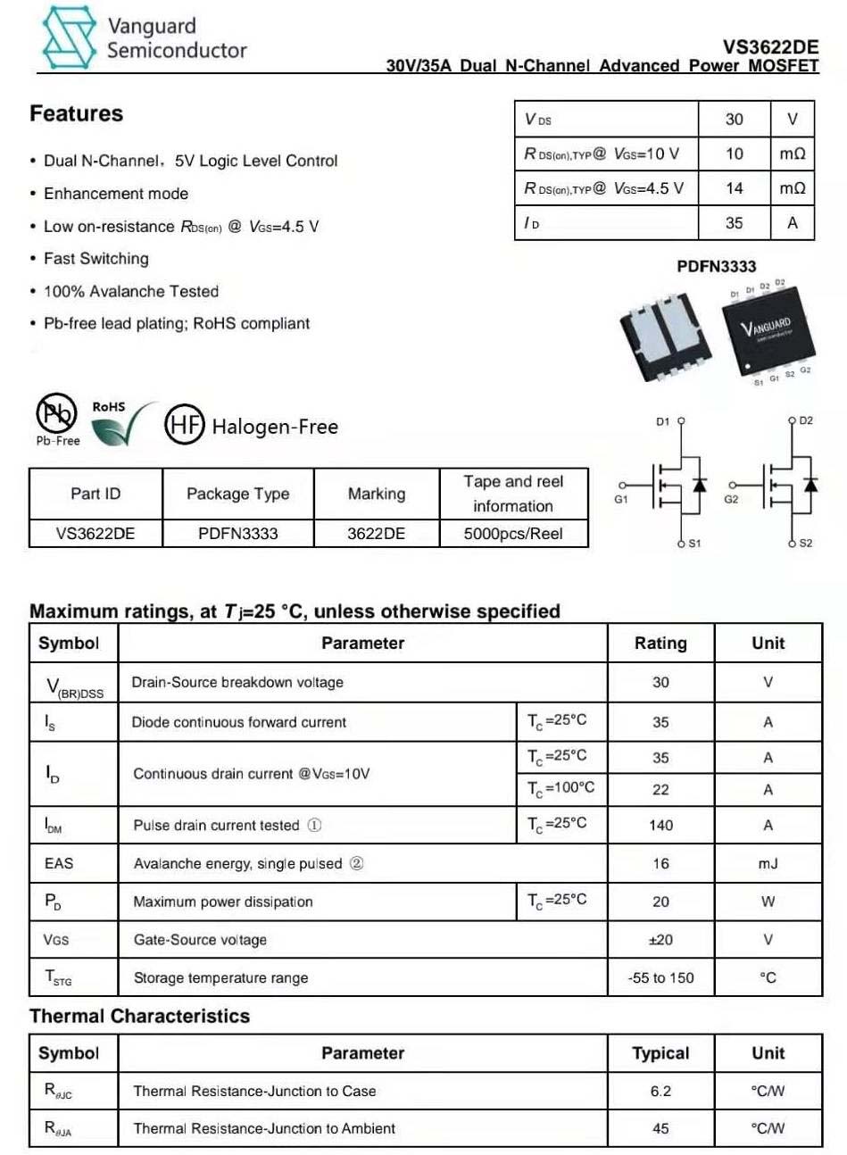 威兆半导体VS3622DE,双NMOS管,耐压30V,PDFN3333封装,这里作为USB-C2和USB-A口的输出VBUS开关。