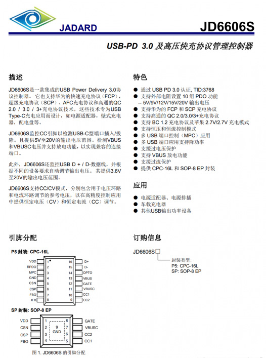 天德钰JD6606S提供恒压恒流控制,支持多口输出控制,支持输出过压,过流保护,并且集成VBUS放电功能,输出协议由电阻灵活配置,并且支持多口输出降功率,支持最大60W到最小18W输出,满足主流PD适配器输出。