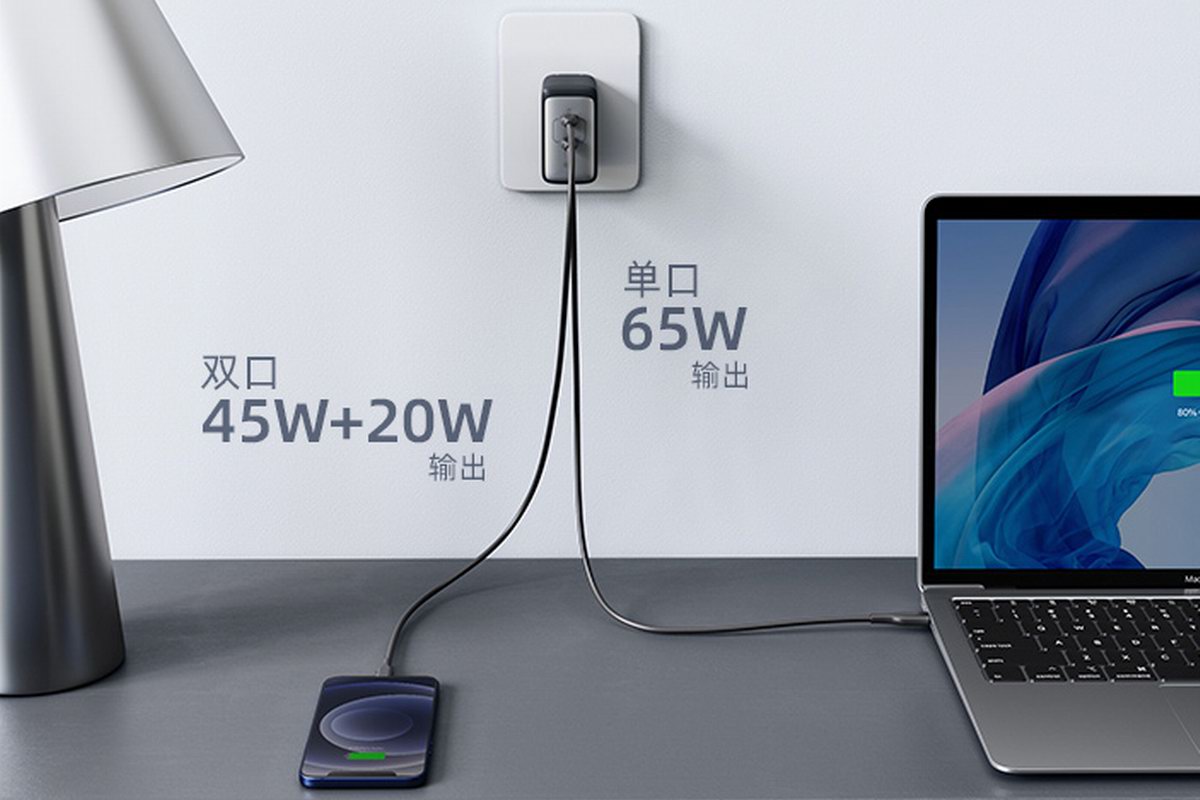 作为多输出口充电器,Anker 65W 双口氮化镓超能充单口使用时最大输出功率65W,双接口使用时,智能调节分配输出功率,调整为45W+20W双口输出,两个设备都处于快充状态。相比起单口充电器优势明显,无需用户中途插拔替换设备,插上自动快速充满。