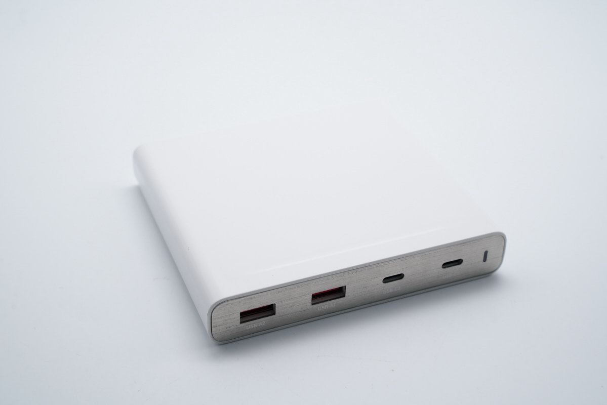 瑞嘉达100W桌面快充充电器外形扁平,方便放置在显示器下面、电视机下面,更接近用户直观地对设备进行充电操作。白色亮面外壳便于清洁,所有输出口一字型排开,2A2C配置100W最大输出功率,同时满足了大功率与多设备使用需求。