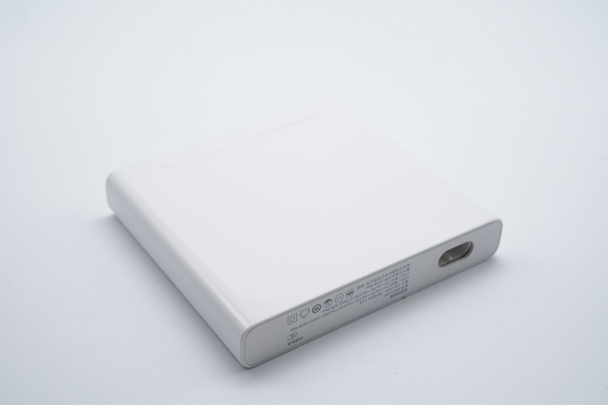 瑞嘉达100W桌面快充充电器三围尺寸分别是 114.14mm X 100.72mm X 19.58mm,重量239g,输入接口采用分体式设计,接口类型为最常见的8字通用接口,使用8字线连接至墙壁插座进行取电。