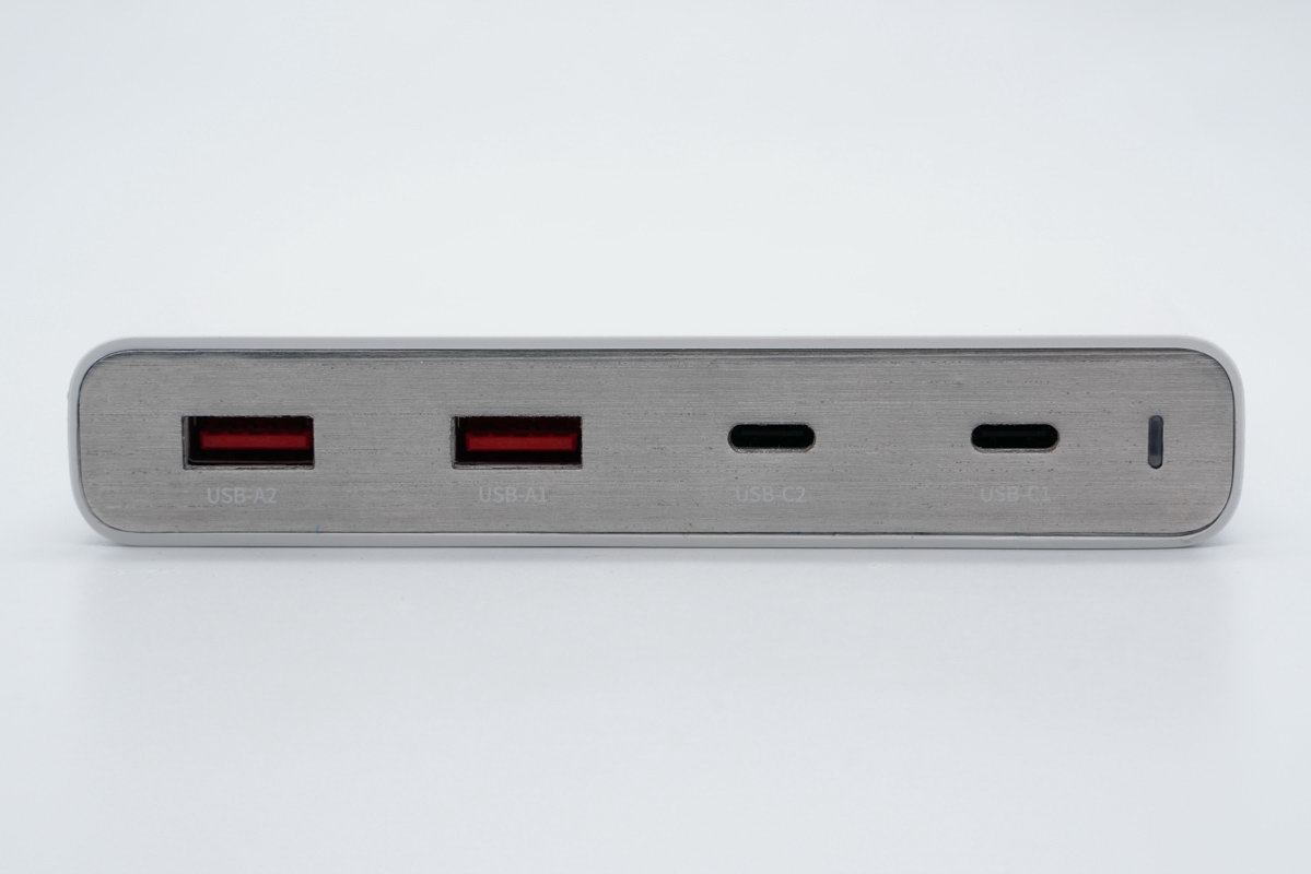 输出接口面板采用了拉丝工艺,最右边带有一个蓝色工作指示灯。接口配置方面,瑞嘉达100W桌面快充充电器共有四个输出口,分别是两个橘色USB-A多协议快充输出口,支持5V3A / 9V3A / 12V2.5A三个固定电压输出,最大输出功率30W;两个USB-C PD快充输出口,支持5V3A / 9V3A / 12V3A / 15V3A / 20V5A五个固定电压输出,带有功率盲插功能,任意插入其中一个USB-C均可获得最大100W输出功率,用户无需记忆接口参数,使用更加方便。