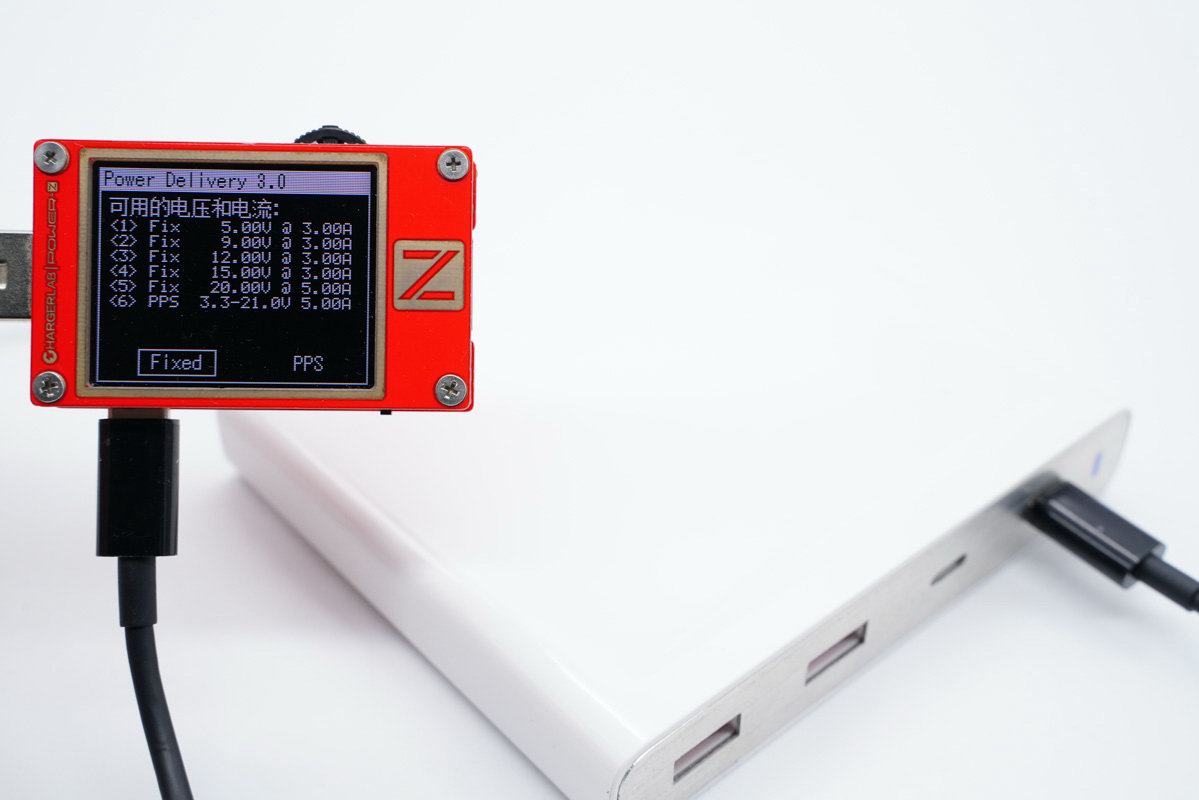 USB-C1、USB-C2支持功率盲插功能,使用POWER-Z KT002 USB测试仪读取USB-C1 PDO报文,基于PD3.0快充标准开发,支持5V3A / 9V3A / 12V3A / 15V3A / 20V5A五个固定电压输出,另外还带有3.3-21V5A一组PPS电压子集。