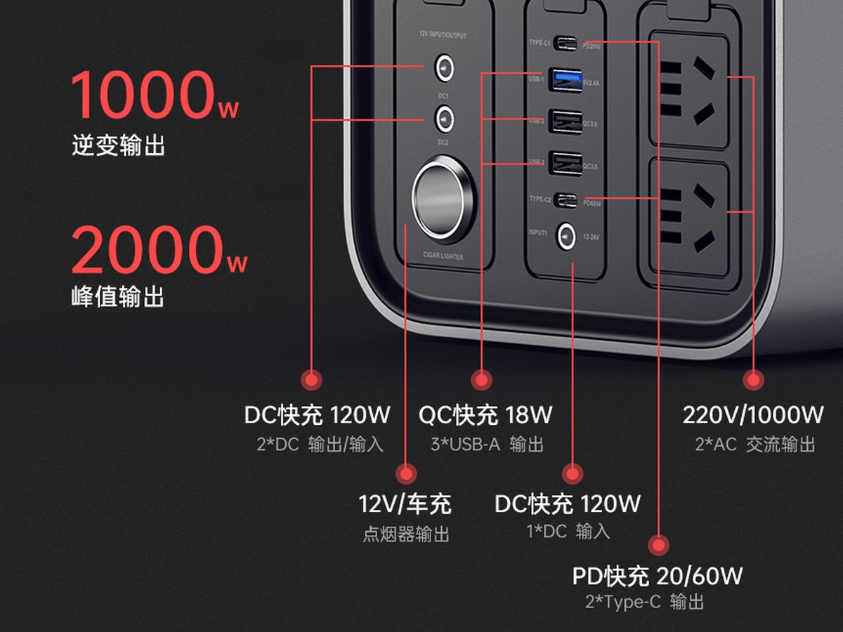 羽博 EN1000S 拥有 1100Wh 超大容量电力储备,配备了 2C3A USB 直流输出接口,支持 60W PD快充输出,能直接对手机、平板、笔记本提供大功率快充支持。带有两个正弦波交流电输出接口,最大输出功率 1000W,与家用市电拥有相同的兼容性,可以驱动市面上绝大部分电器运行,支持 120W DC + 200W 航空口双通道同时输入,最高功率达300W,仅需 4 小时即可充满自身,快速满血恢复续航性能。羽博 EN1000S 目前已经上架京东羽博旗舰店,售价为 4680 元,感兴趣的小伙伴可以自行上车。