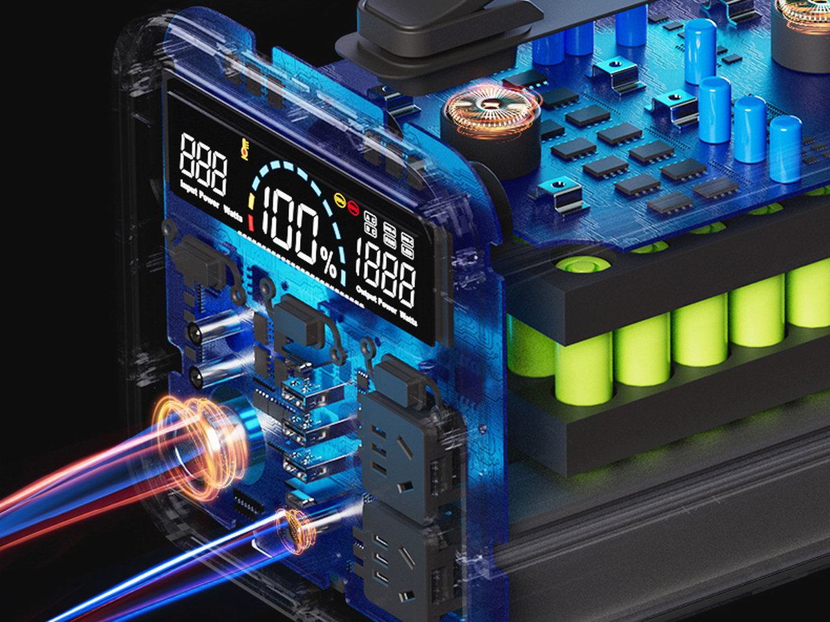 羽博 EN1000S “能量黑牛”是羽博户外电源家族里旗舰级产品,拥有 1000W 正弦波大功率逆变输出,搭载了一块多功能信息屏,让用户清晰了解当前工作状况。产品顶部带有提手设计方便移动搬运,在面板的另一端是 LED 照明灯板,为用户夜间作业环境提供应急照明,避免摸黑操作。