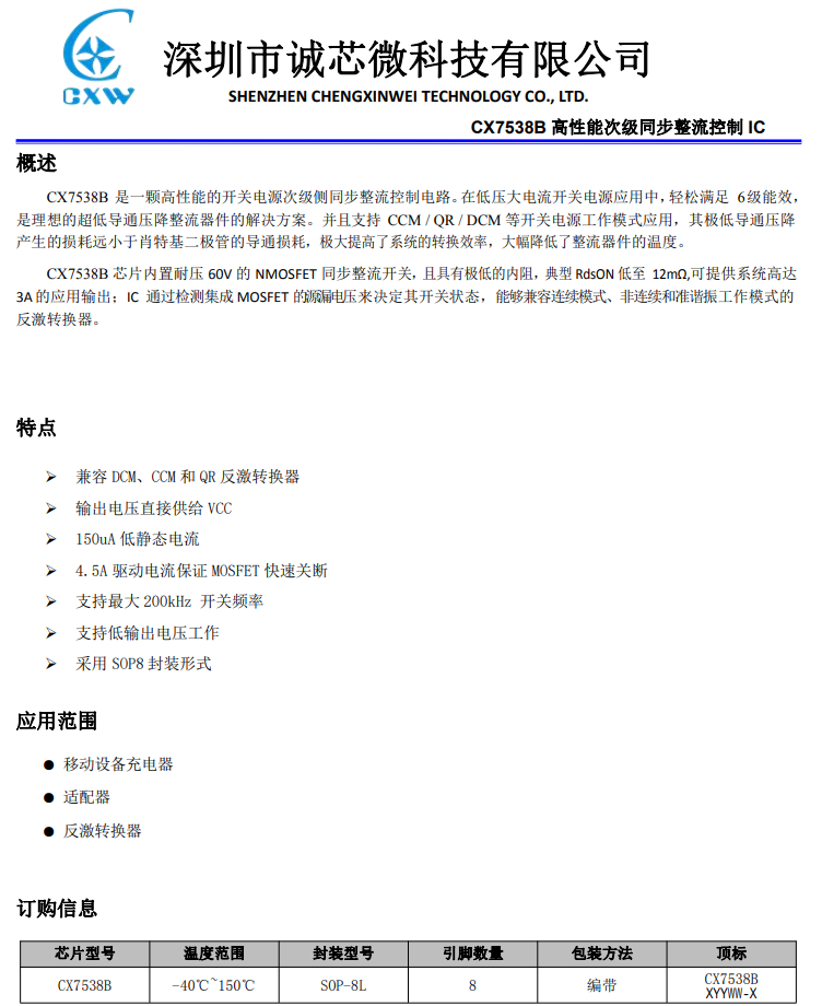 诚芯微CX7538B 支持开关电源的CCM/QR/DCM模式,非常适合3.3~12V快充同步整流使用,内置耐压60V,11mΩ的同步整流管,可提供3A输出。比肖特基效率最高提升6%,工作电压范围宽,外围元件非常简单,在宽电压应用时,外围只需一颗电容。