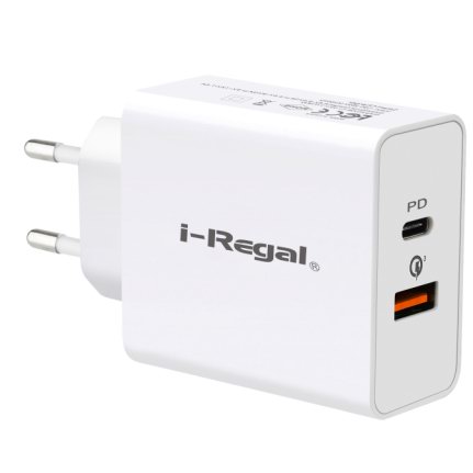 IRG-UW109 1A1C双输出口配置, 双口独立,PD+QC 18W+18W,全局最大输出功率36W。可做美规,中规,欧规,英规韩规,支持100-240V 50/60Hz 0.8A全球电压。USB-C支持5V3A / 9V2A / 12V1.5A三挡固定输出电压,输出功率18W,USB-A支持5V3A / 9V2A / 12V1.5A快速充电,最大输出功率18W,产品可过CE,KC 等认证。