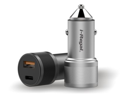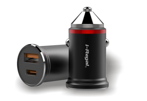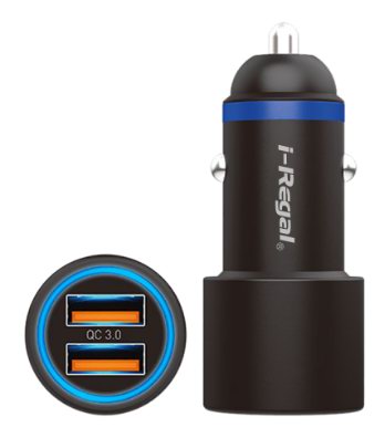 IRG-UC17 双USB-A车载充电器,双口独立,QC+QC 18W+18W全局最大输出36W,也可以做QC3.0+5V2.4A方案,18W+12W。采用铝合金+ABS材质,带LED灯圈 ,支持12-24V电压, USB口支持5V/3A,9V/2A,12V/1.5A三个档位输出,全局最大功率为36W。