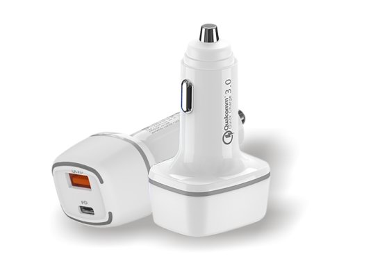 IRG-UC23 1A1C车载充电器,PD&QC3.0 车充,双路独立18W+18W,最大输出功率36W。采用PC+ABS材质制作,带2个LED灯圈 ,支持12-24V电压。USB-C口支持5V/3A,9V/2A,12V/1.5A三个档位输出,USB-A口输出为5V/3A,9V/2A,12V/1.5A,全局最大功率为36W。另外,也可做QC3.0+2.4A 方案, 18W+12W,全局最大功率为30W。