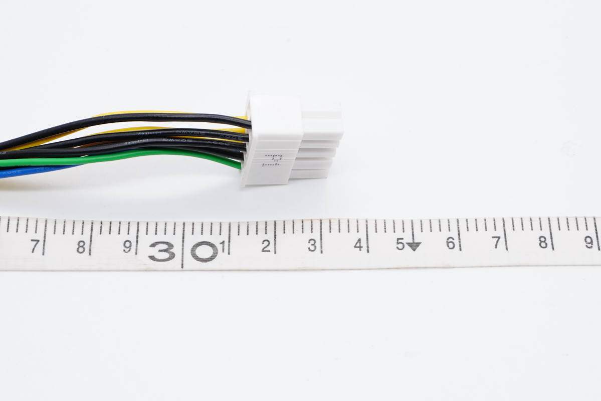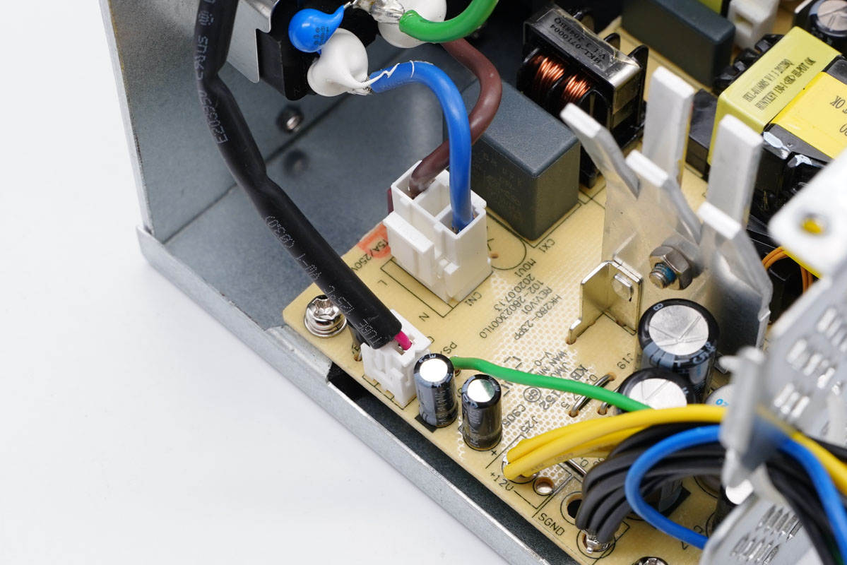 输出端特写,绿线为PS/ON,黄线为12V输出正极,黑线为负极,蓝线为负12V输出。