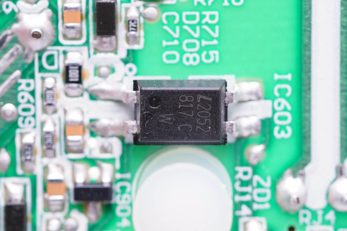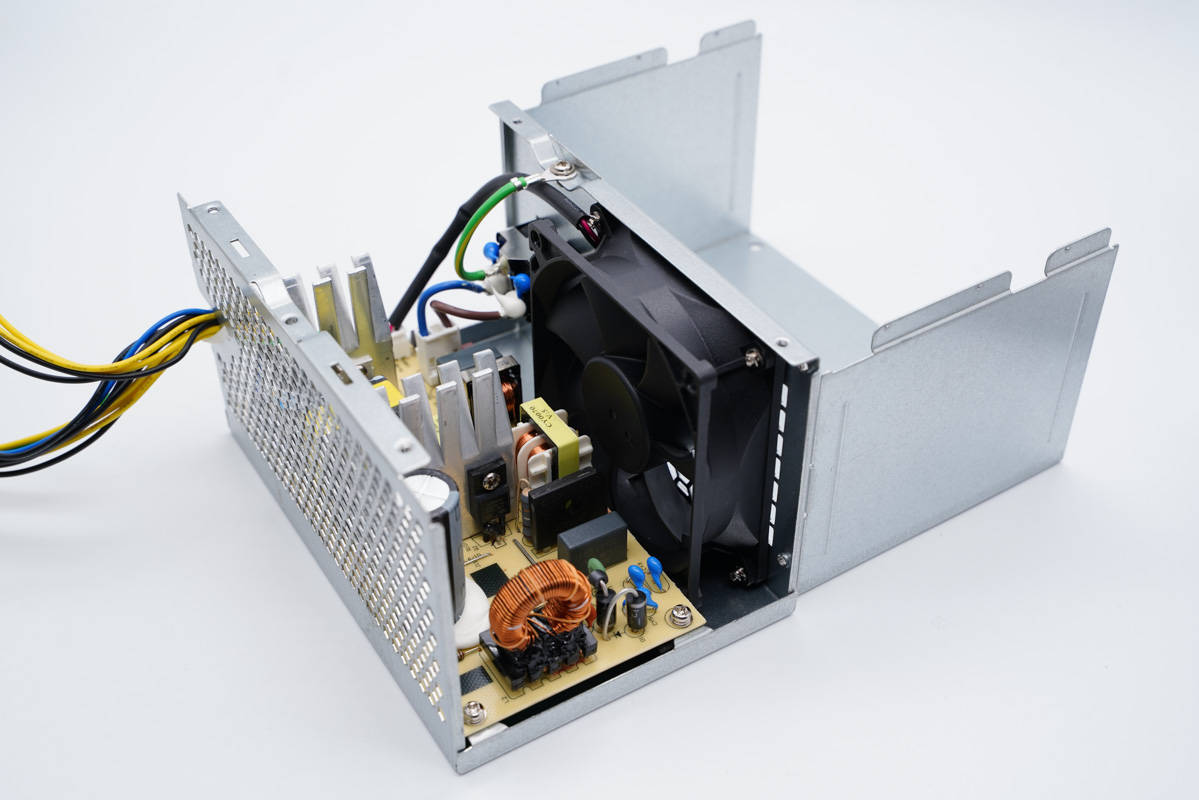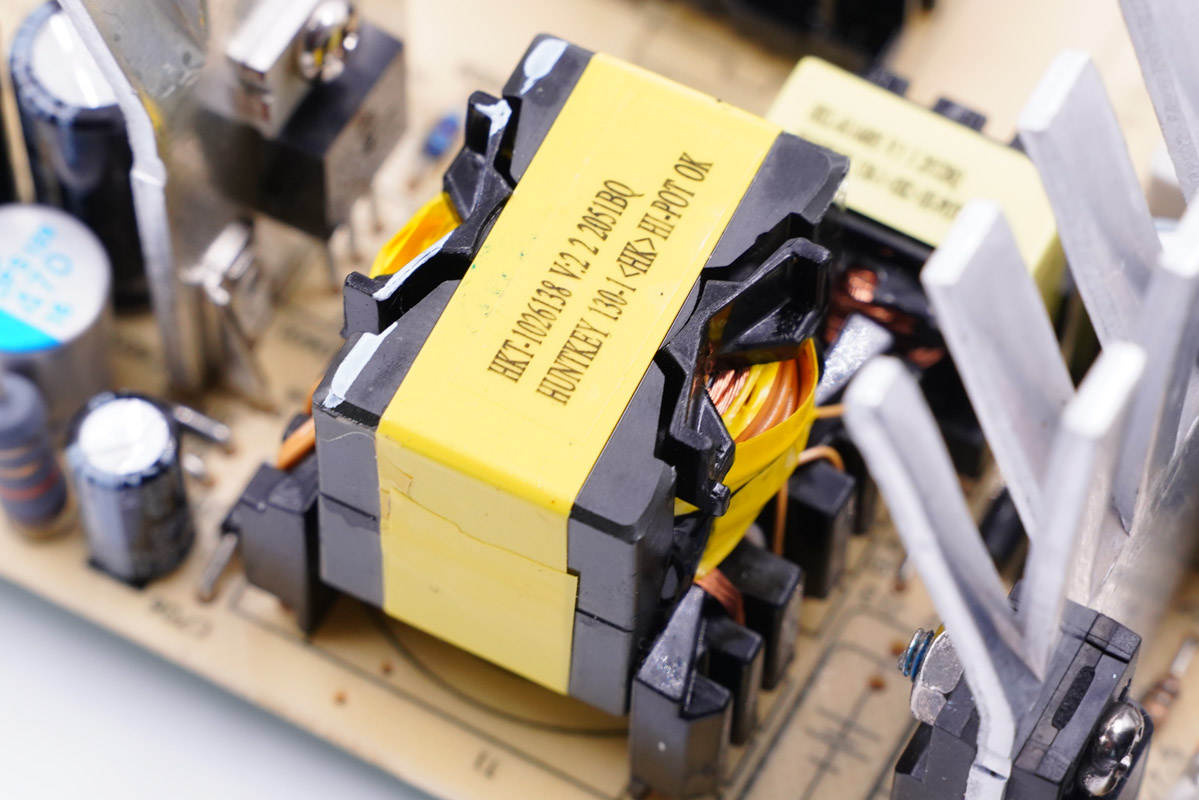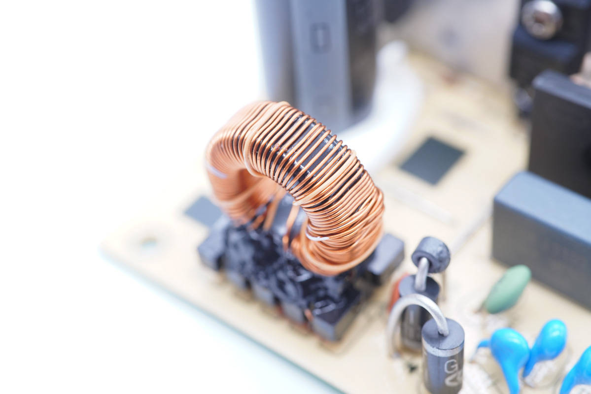 拆开后发现,电源电路板上的元器件分布稀疏,也是为了更好的散热,内置风扇可以进一步提升电源的散热效果。通过观察发现,这款电源采用PFC+LLC架构,磁环电感为PFC升压电感。主控芯片采用恩智浦TEA1716T,开关管全部来自意法半导体,器件全部来自国际知名大厂。变压器和谐振电感均采用利兹线绕制,降低高频损耗。