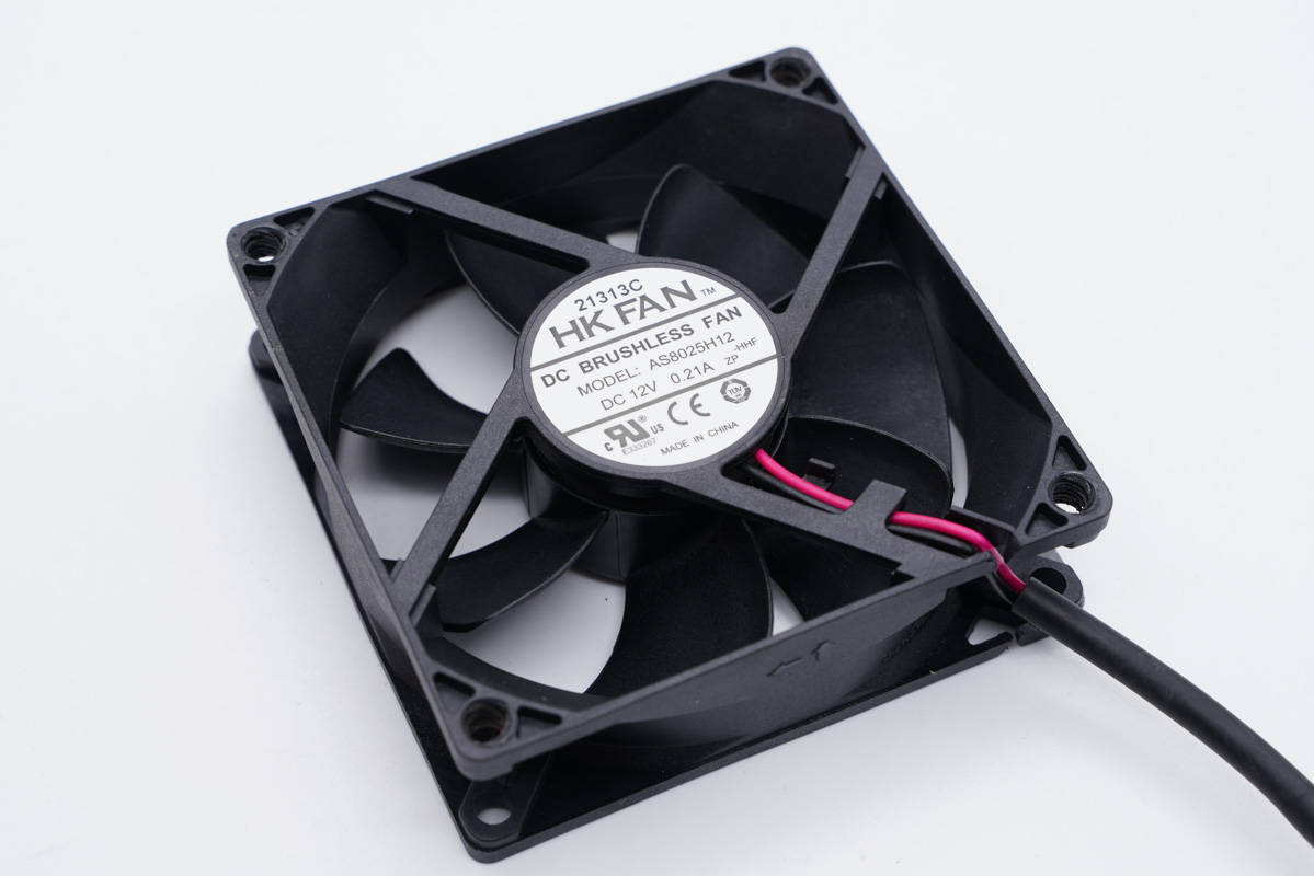 电源散热风扇来自航嘉,型号AS8025H12,8025尺寸,12V0.21A输入,通过了CE认证。