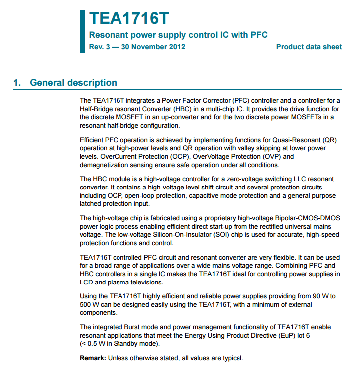 电源主控芯片采用NXP恩智浦TEA1716T,是一款具有集成间歇频率工作模式、符合EuP lot 6的半桥谐振LLC+升压PFC组合控制器,适用于液晶电视、笔记本适配器、台式机及一体机电源。