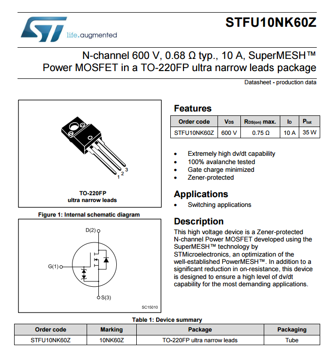PFC升压开关管采用意法STFU10NK60Z,耐压600V,导阻0.75Ω,引脚套热缩管绝缘。