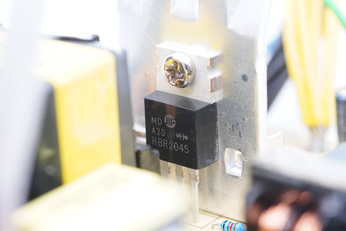 LLC输出采用吉林华微肖特基整流管HBR2045整流输出,初级采用金山电解电容,输出采用红宝石长寿命电解与固态电容配合使用,保证滤波效果和使用寿命。