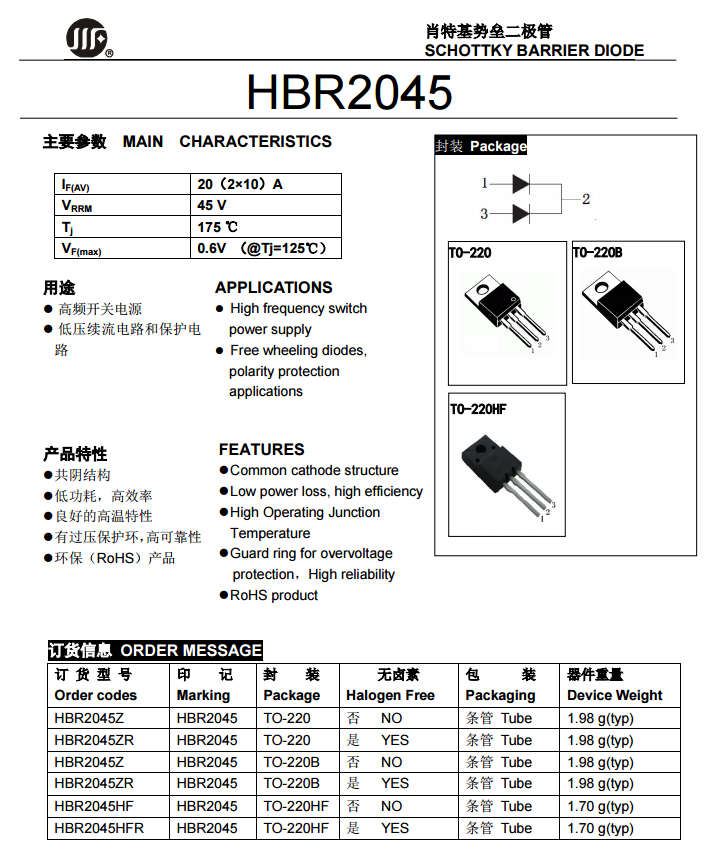 吉林华微HBR2045,耐压45V,20A肖特基整流管,用于电源整流输出。
